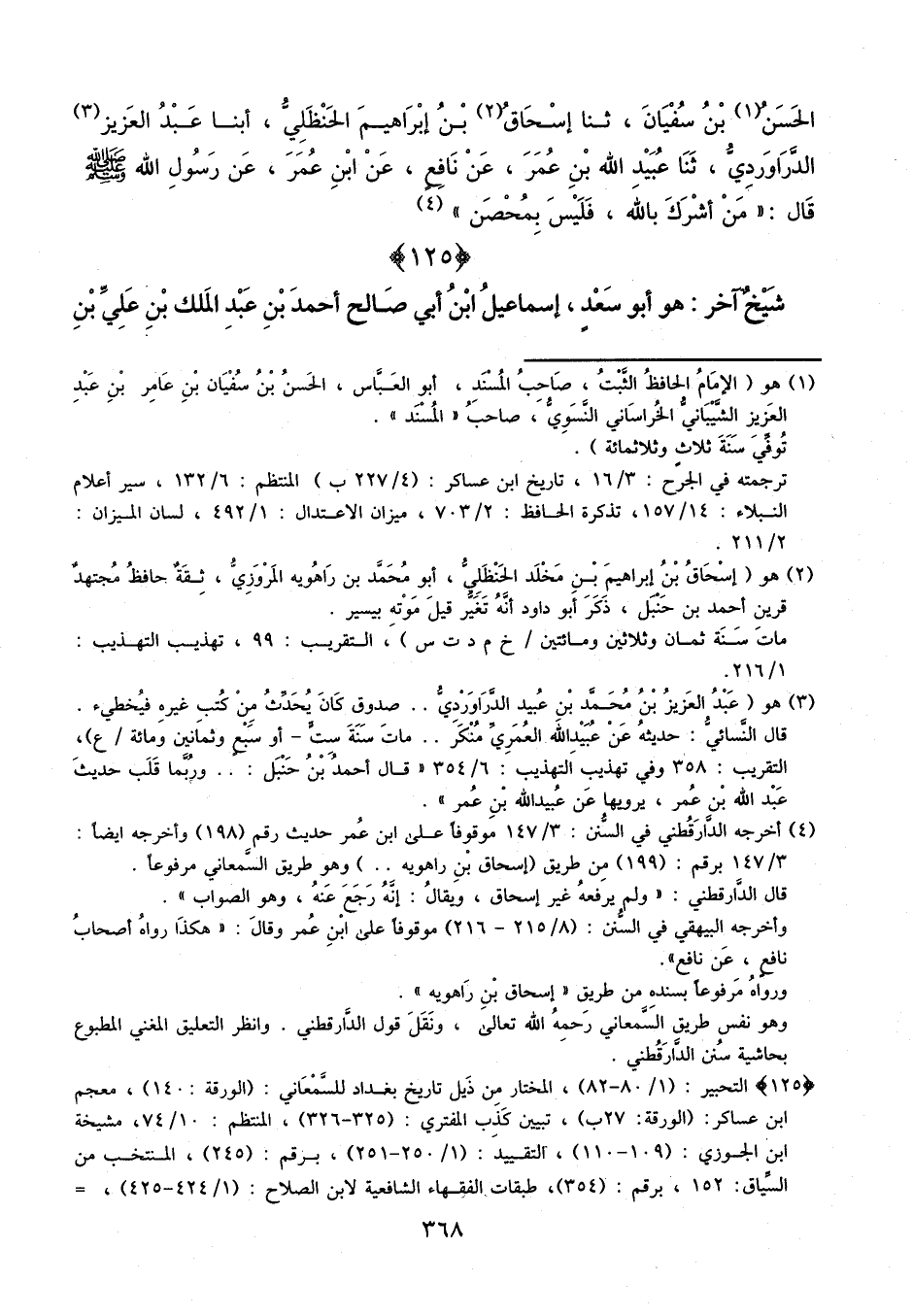 الْحَسَنُ بْنُ سُفْيَانَ، ثَنَا إِسْحَاقُ بْنُ إِبْرَاهِيمَ الْحَنْظَلِيُّ، أبنا عَبْدُ الْعَزِيزِ الدَّرَاوَرْدِيُّ، ثنا عُبَيْدُ اللَّهِ بْنُ عُمَرَ، عَنْ نَافِعٍ، عَنِ ابْنِ عُمَرَ، عَنْ رَسُولِ اللَّهِ، صَلَّى اللَّهُ عَلَيْهِ وَسَلَّمَ، قَالَ: «مَنْ أَشْرَكَ بِاللَّهِ، فَلَيْسَ بِمُحْصَنٍ»