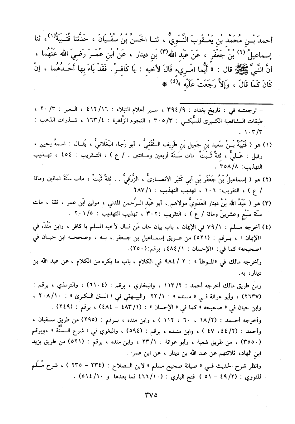 أَحْمَدَ بْنِ مُحَمَّدِ بْنِ يَعْقُوبَ النَّسَوِيُّ، ثَنَا الْحَسَنُ بْنُ سُفْيَانَ، حَدَّثَنَا قُتَيْبَةُ بْنُ سَعِيدٍ، ثنا إِسْمَاعِيلُ بْنُ جَعْفَرٍ، عَنْ عَبْدِ اللَّهِ بْنِ دِينَارٍ، عَنِ ابْنِ عُمَرَ، رَضِيَ اللَّهُ عَنْهُمَا، أَنَّ النَّبِيَّ، صَلَّى اللَّهُ عَلَيْهِ وَسَلَّمَ، قَالَ: " أَيُّمَا امْرِئٍ قَالَ لِأَخِيهِ: يَا كَافِرُ، فَقَدْ بَاءَ بِهَا أَحَدُهُمَا، إِنْ كَانَ كَمَا قَالَ، وَإِلا رَجَعَتْ عَلَيْهِ ".