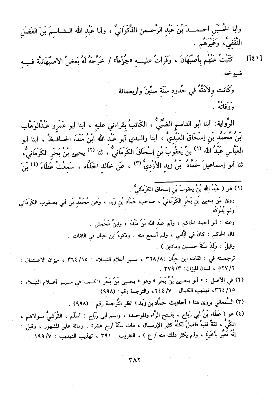 أَبْنَا أَبُو الْقَاسِمِ الضَّبِّيُّ الْكَاتِبُ، بِقِرَاءَتِي عَلَيْهِ، أَبْنَا أَبُو عَمْرٍو عَبْدُ الْوَهَّابِ بْنُ مُحَمَّدِ بْنِ إِسْحَاقَ الْعَبْدِيُّ، أبنا وَالِدِي أَبُو عَبْدِ اللَّهِ بْنُ مَنْدَهْ الْحَافِظُ، أَبْنَا أَبُو الْعَبَّاسِ عَبْدُ اللَّهِ بْنُ يَعْقُوبَ بْنِ إِسْحَاقَ الْكِرْمَانِيُّ، ثنا يَحْيَى بْنُ بَحْرٍ الْكِرْمَانِيُّ، ثنا أَبُو إِسْمَاعِيلَ حَمَّادُ بْنُ زَيْدٍ الأَزْدِيُّ، عَنْ خَالِدٍ الْحَذَّاءِ، سَمِعْتُ عَطَاءَ بْنَ