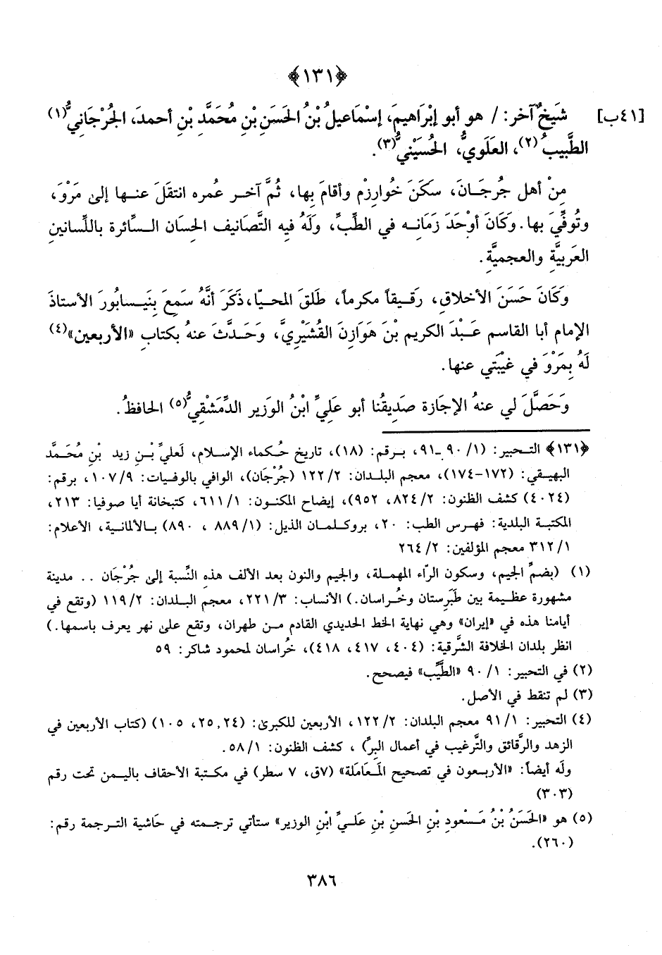 شيخ آخر: هو أبو إبراهيم إسماعيل بن الحسن بن محمد بن أحمد الجرجاني الطبيب العلوي الحسيني.
