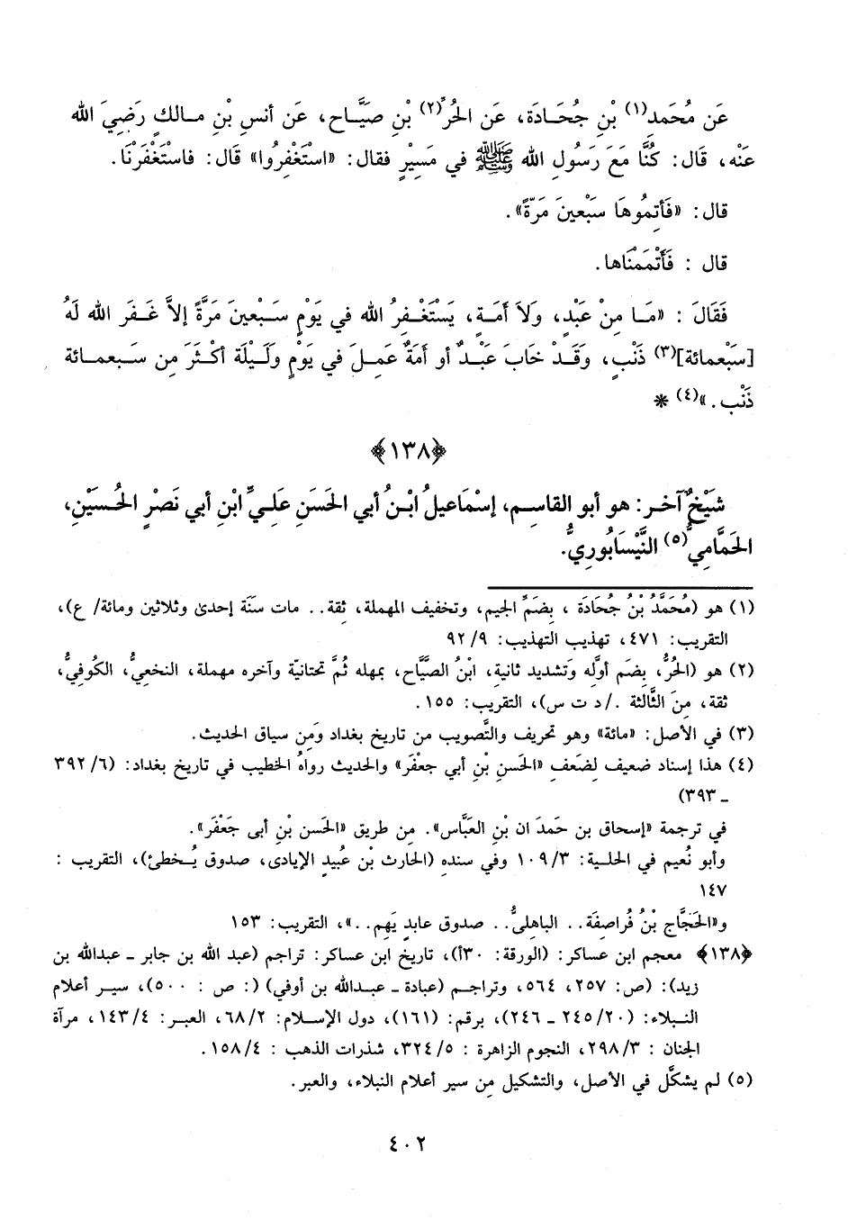 عَنْ مُحَمَّدِ بْنِ جُحَادَةَ، عَنِ الْحُرِّ بْنِ صِيَاحٍ، عَنْ أَنَسِ بْنِ مَالِكٍ، رَضِيَ اللَّهُ عَنْهُ، قَالَ: كُنَّا مَعَ رَسُولِ اللَّهِ، صَلَّى اللَّهُ عَلَيْهِ وَسَلَّمَ، فِي مَسِيرٍ، فَقَالَ: «اسْتَغْفِرُوا» ، قَالَ: فَاسْتَغْفَرْنَا، قَالَ: «فَأَتِمُّوهَا سَبْعِينَ مَرَّةً» ، قَالَ: فَأَتْمَمْنَاهَا، قَالَ: فَقَالَ: «مَا مِنْ عَبْدٍ، وَلا أَمَةٍ يَسْتَغْفِرُ اللَّهَ فِي يَوْمٍ سَبْعِينَ مَرَّةً إِلا غَفَرَ اللَّهُ لَهُ سَبْعَ مِائَةِ ذَنْبٍ، وَقَدْ خَابَ عَبْدٌ أَوْ أَمَةٌ عَمِلَ فِي يَوْمٍ وَلَيْلَةٍ أَكْثَرَ مِنْ سَبْعِ مِائَةِ ذَنْبٍ»