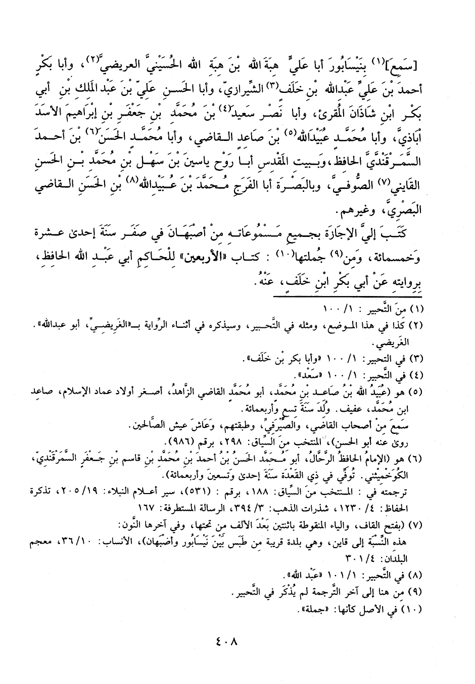 كتب إلي الإجازة بجميع مسموعاته من أصبهان، في صفر سنة إحدى عشرة وخمس مائة، ومن جملتها: كتاب الأربعين للحاكم أبي عبد الله الحافظ، بروايته عن أبي بكر بن خلف، عنه.
