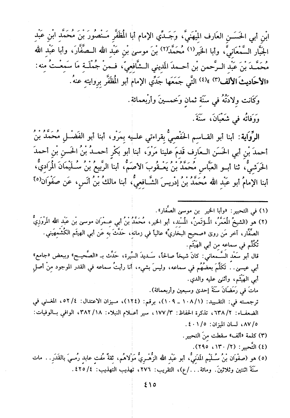 بن أبي الحسن العارف الميهني، وجدي الإمام المظفر منصور بن محمد بن عبد الجبار السمعاني، وأبا الخير محمد بن موسى بن عبد الله الصفار، وأبا عبد الله محمد بن عبد الرحمن بن أحمد المديني الشافعي، فمن جملة ما سمعت منه: الأحاديث الألف التي جمعها جدي الإمام أبو المظفر بروايته عنه.