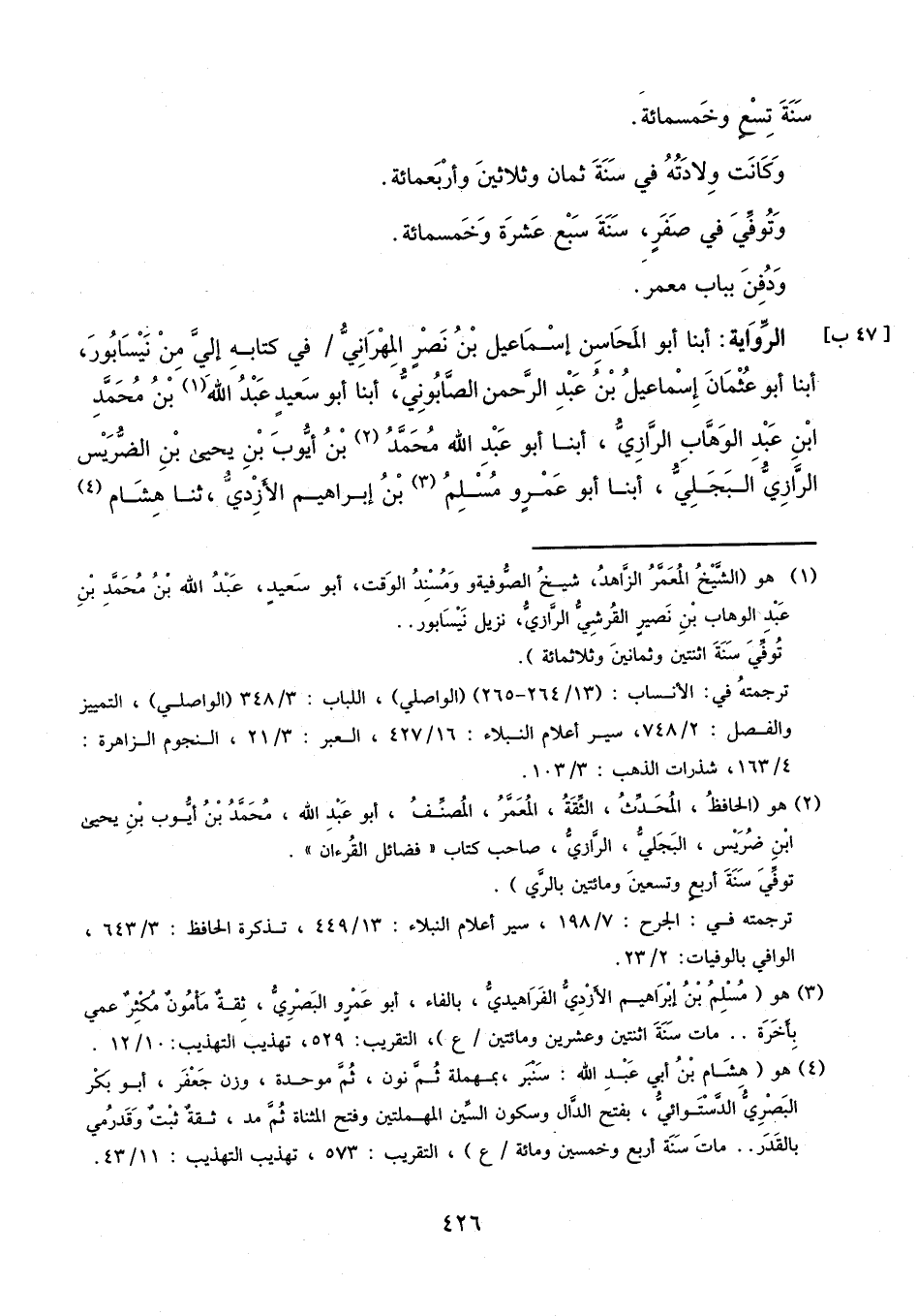 أَبْنَا أَبُو الْمَحَاسِنِ إِسْمَاعِيلُ بْنُ نَصْرٍ الْمِهْرَانِيُّ فِي كِتَابِهِ إِلَيَّ مِنْ نَيْسَابُورَ، أَبْنَا أَبُو عُثْمَانَ إِسْمَاعِيلُ بْنُ عَبْدِ الرَّحْمَنِ الصَّابُونِيُّ، أبنا أَبُو سَعِيدِ بْنُ مُحَمَّدِ بْنِ عَبْدِ الْوَهَّابِ الرَّازِيُّ، أبنا أَبُو عَبْدِ اللَّهِ مُحَمَّدُ بْنُ أَيُّوبَ بْنِ يَحْيَى بْنِ الضَّرِيسِ الرَّازِيُّ الْبَجَلِيُّ، أبنا أَبُو عَمْرٍو مُسْلِمُ بْنُ إِبْرَاهِيمَ الأَزْدِيُّ، ثنا هِشَامٌ