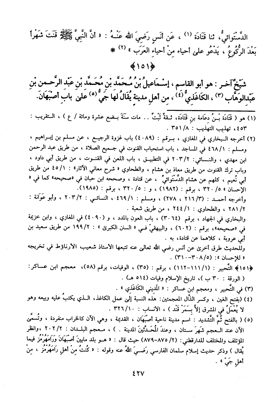 الدَّسْتُوَائِيُّ، ثنا قَتَادَةُ، عَنْ أَنَسٍ، رَضِيَ اللَّهُ عَنْهُ: «أَنَّ النَّبِيَّ، صَلَّى اللَّهُ عَلَيْهِ وَسَلَّمَ، قَنَتَ شَهْرًا بَعْدَ الرُّكُوعِ يَدْعُو عَلَى أحَيَاءٍ مِنْ أَحْيَاءِ الْعَرَبِ»