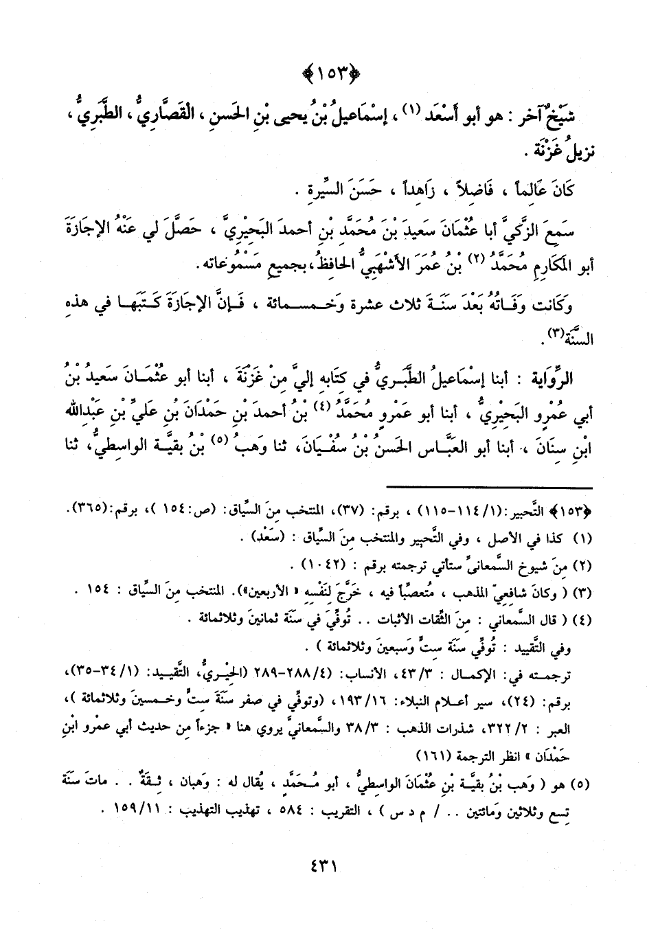 أَبْنَا إِسْمَاعِيلُ الطَّبَرِيُّ فِي كِتَابِهِ إِلَيَّ مِنْ غَزْنَةَ، أبنا أَبُو عُثْمَانَ سَعِيدُ بْنُ أَبِي عَمْرٍو الْبَحِيرِيُّ، أبنا أَبُو عَمْرٍو مُحَمَّدُ بْنُ أَحْمَدَ بْنِ حَمْدَانَ بْنِ عَلِيِّ بْنِ عَبْدِ اللَّهِ بْنِ سِنَانٍ، أبنا أَبُو الْعَبَّاسِ الْحَسَنُ بْنُ سُفْيَانَ، ثنا وَهْبُ بْنُ بَقِيَّةَ الْوَاسِطِيُّ، ثنا