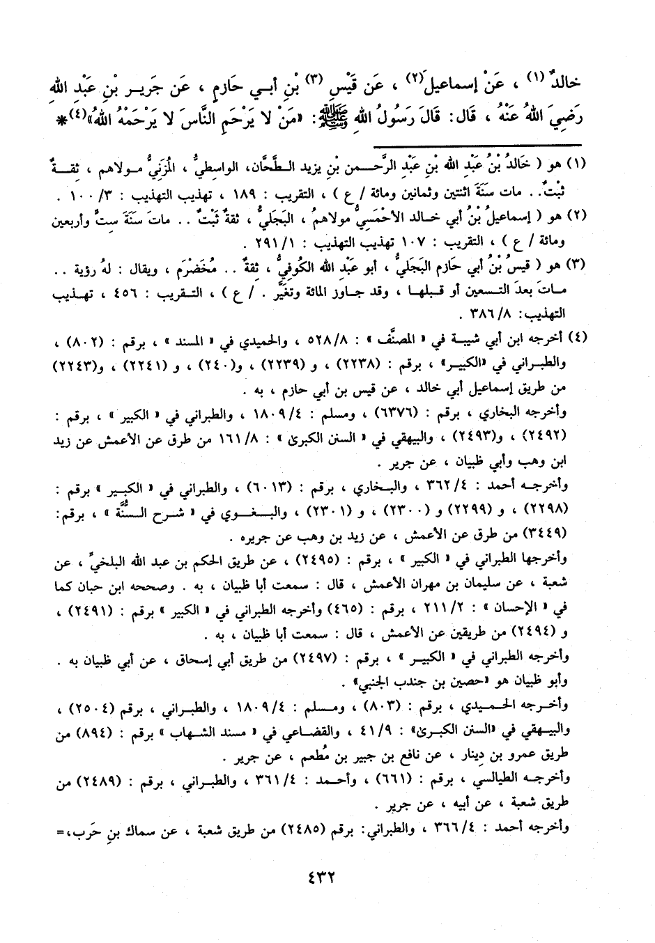 خَالِدٌ، عَنْ إِسْمَاعِيلَ، عَنْ قَيْسِ بْنِ أَبِي حَازِمٍ، عَنْ جَرِيرِ بْنِ عَبْدِ اللَّهِ، رَضِيَ اللَّهُ عَنْهُ، قَالَ: قَالَ رَسوُلُ اللَّهِ، صَلَّى اللَّهُ عَلَيْهِ وَسَلَّمَ: «مَنْ لا يَرْحَمِ النَّاسَ، لا يَرْحَمْهُ اللَّهُ»
