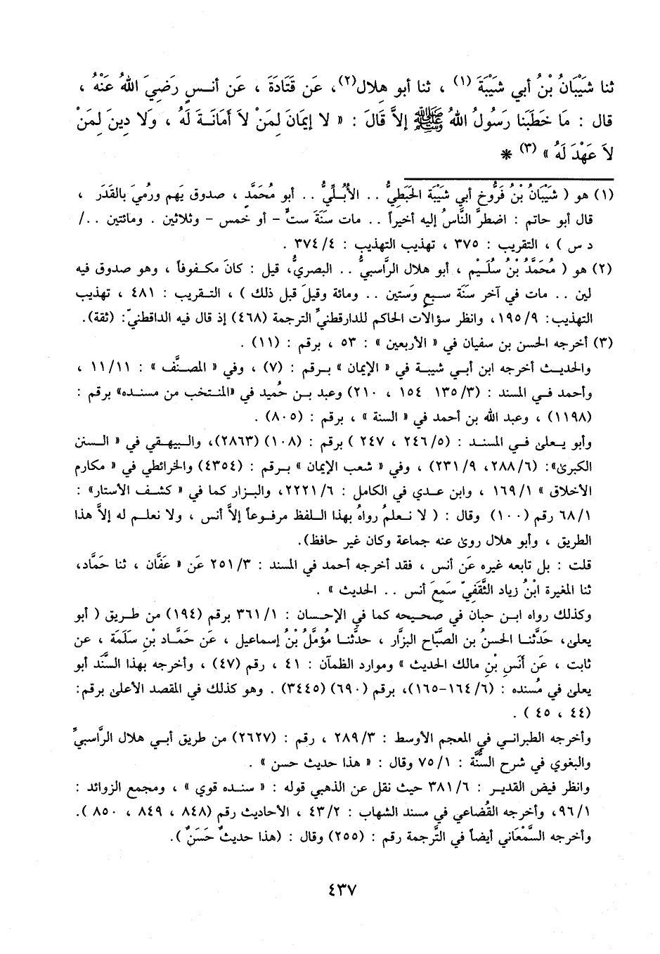 ثنا شَيْبَانُ بْنُ أَبِي شَيْبَةَ، ثنا أَبُو هِلالٍ، عَنْ قَتَادَةَ، عَنْ أَنَسٍ، رَضِيَ اللَّهُ عَنْهُ، قَالَ: مَا خَطَبَنَا رسول اللَّهِ، صَلَّى اللَّهُ عَلَيْهِ وَسَلَّمَ، إِلا قَالَ: «لا إِيمَانَ لِمَنْ لا أَمَانَةَ لَهُ، وَلا دِينَ لِمَنْ لا عَهْدَ لَهُ»