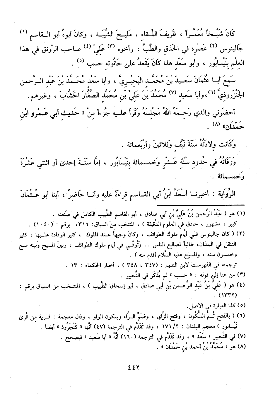 كان شيخا معمرا، ظريف اللقاء، مليح الشيبة، وكان أبوه أبو القاسم جالينوس عصره في الحذق والطب، وأخوه علي صاحب الرونق في هذا العلم بنيسابور، وأبو سعد هذا كان يقعد على حانوته حسب.
