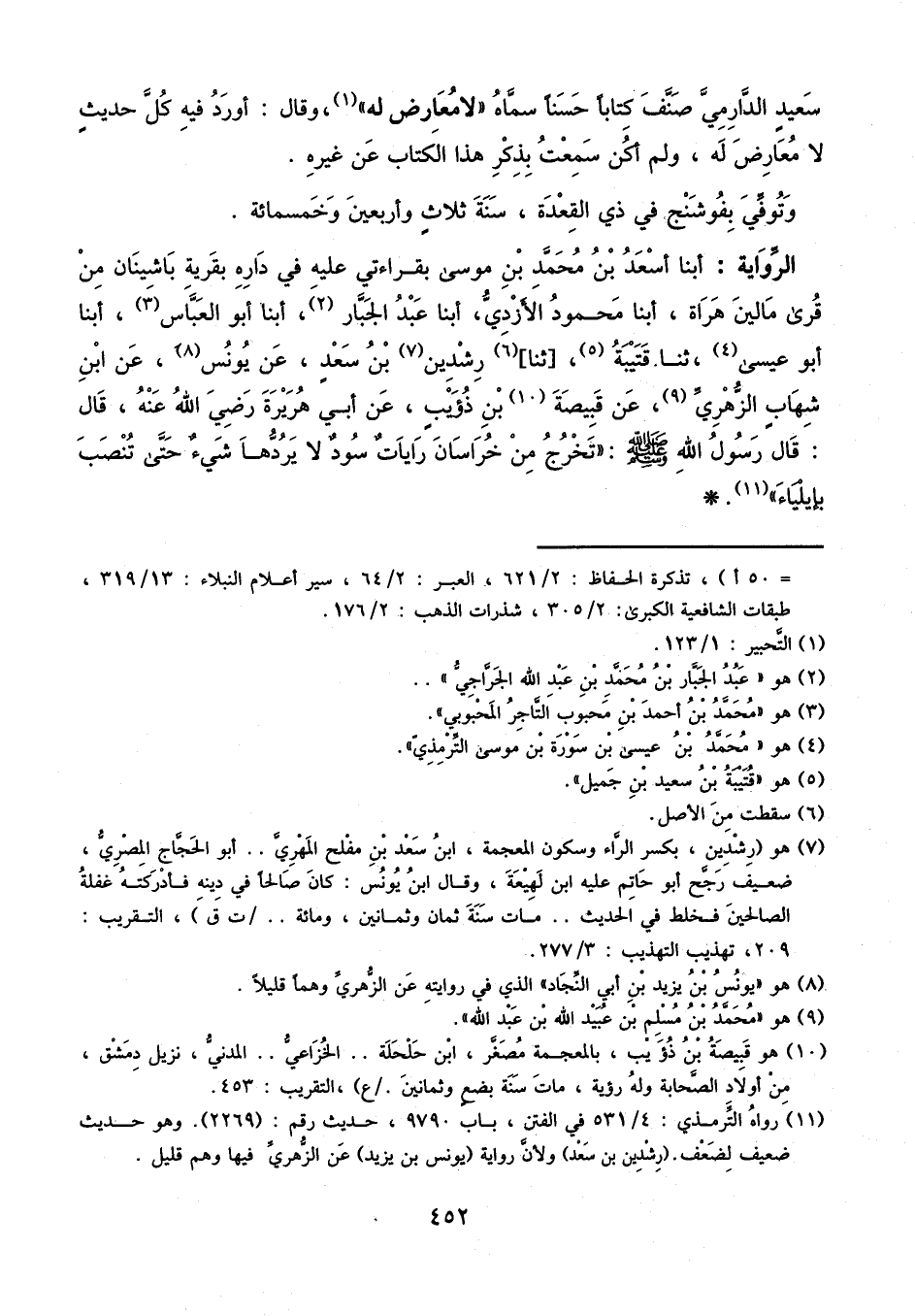 سعيد الدارمي، صنف كتابا حسنا سماه لا «معارض له» ، وقال: أورد فيه كل حديث لا معارض له، ولم أكن سمعت بذكر هذا الكتاب عن غيره.