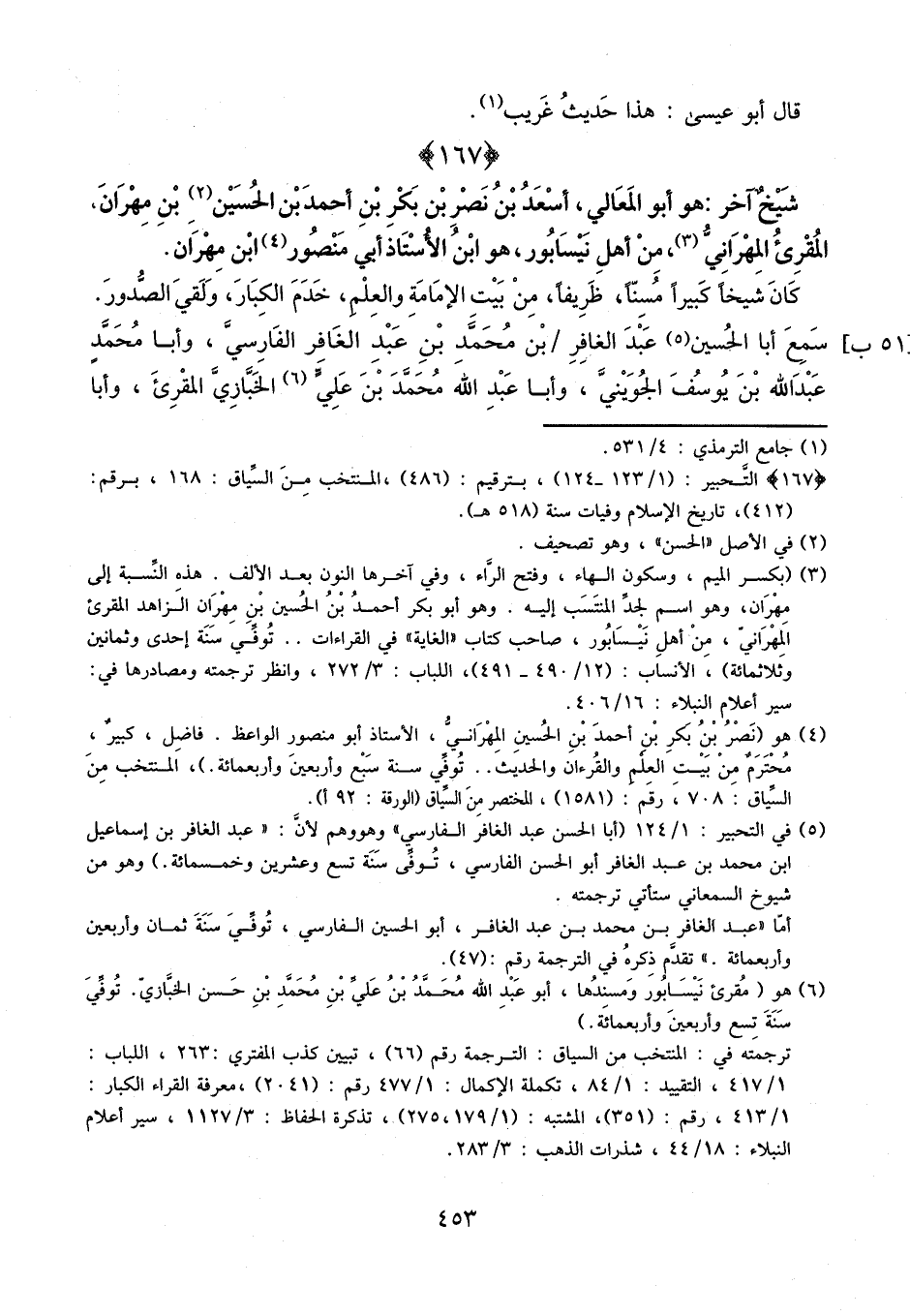 شيخ آخر: هو أبو المعالي أسعد بن نصر بن بكر بن أحمد بن الحسين بن مهران المقرئ المهراني، من أهل نيسابور، هو ابن الأستاذ أبي منصور بن مهران.