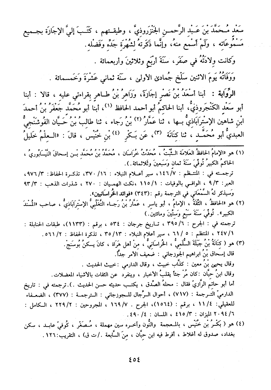 سعد محمد بن عبد الرحمن الجنزروذي، وطبقتهم، كتب إلي الإجازة بجميع مسموعاته، ولم أسمع منه، وإنما ذكرته لشهرة جده وفضله.