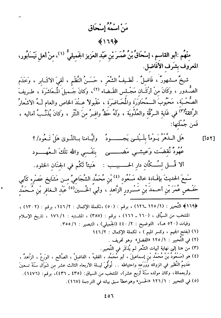 منهم أبو القاسم إسحاق بن عمر بن عبد العزيز الجميلي، من أهل نيسابور، المعروف بشرف الأفاضل.