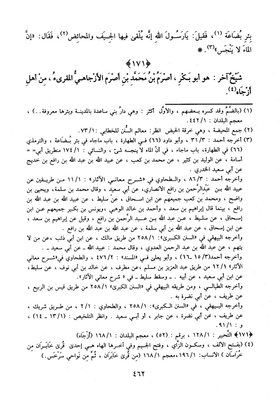 بِئْرِ بُضَاعَةٍ، فَقِيلَ لَهُ: يَا رَسُولَ اللَّهِ، إِنَّهُ يُلْقَى فِيهَا الْجِيَفُ وَالْمَحَائِضُ، فَقَالَ: «إِنَّ الْمَاءَ لا يَنْجُسُ»