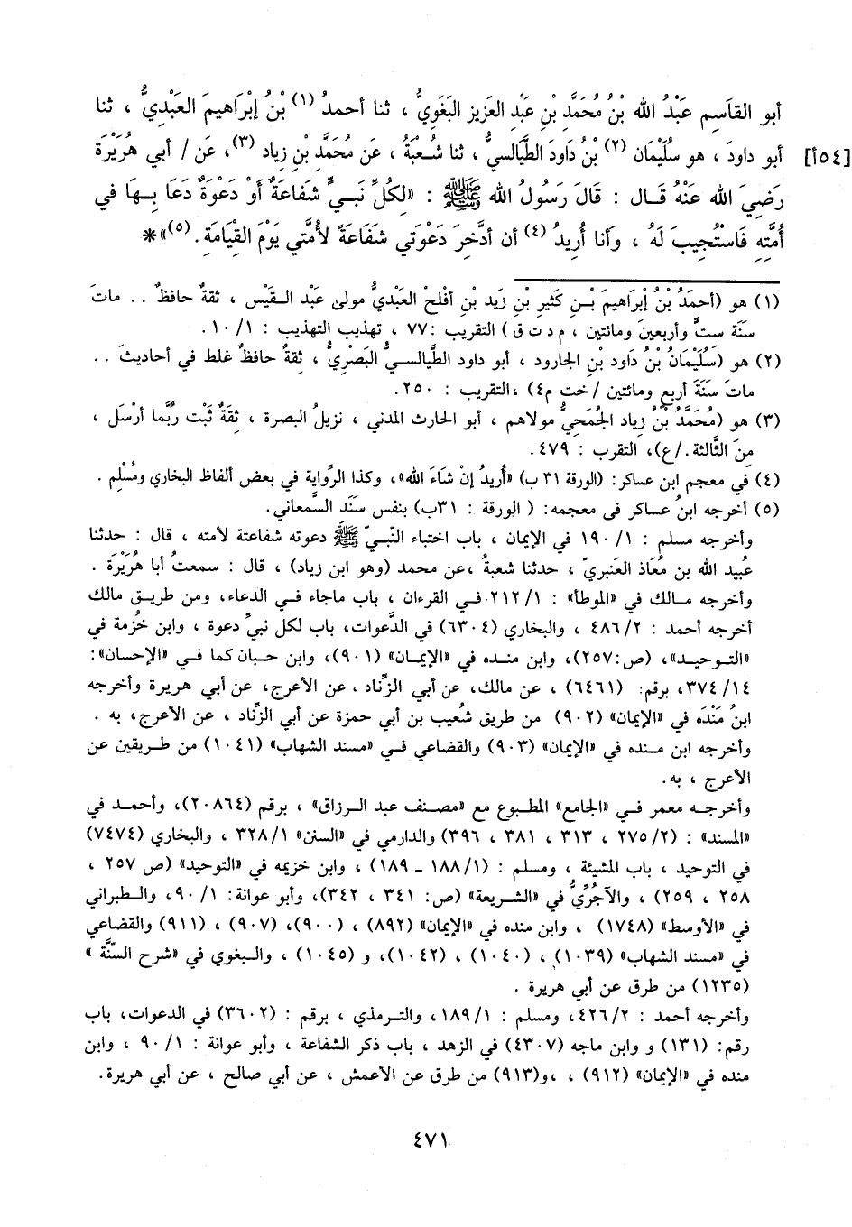 أَبُو الْقَاسِمِ عَبْدُ اللَّهِ بْنُ مُحَمَّدِ بْنِ عَبْدِ الْعَزِيزِ الْبَغَوِيُّ، ثَنَا أَحْمَدُ بْنُ إِبْرَاهِيمَ الْعَبْدِيُّ، ثَنَا أَبُو دَاوُدَ، هُوَ سُلَيْمَانُ بْنُ دَاوُدَ الطَّيَالِسِيُّ، ثَنَا شُعْبَةُ، عَنْ مُحَمَّدِ بْنِ زِيَادٍ، عن أَبِي هُرَيْرَةَ، رَضِيَ اللَّهُ عَنْهُ، قَالَ: قَالَ رَسُولُ اللَّهِ، صَلَّى اللَّهُ عَلَيْهِ وَسَلَّمَ: «لِكُلِّ نَبِيٍّ شَفَاعَةٌ أوْ دَعْوَةٌ دَعَا بِهَا فِي أُمَّتِهِ فَاسْتُجِيبَ لَهُ، وَإِنِّي أُرِيدُ أَنْ أَدَّخِرَ دَعْوَتِي، شَفَاعَةً لأُمَّتِي يَوْمَ الْقِيَامَةِ»