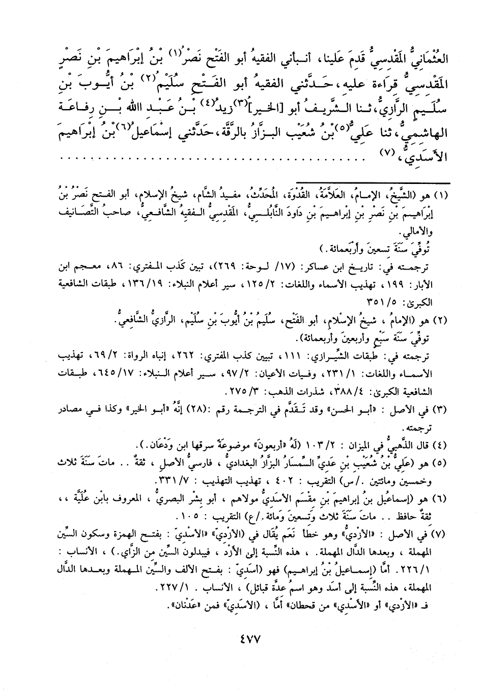 الْعُثْمَانِيُّ الْمَقْدِسِيُّ، قَدِمَ عَلَيْنَا، أَنْبَأَنِي الْفَقِيهُ أَبُو الْفَتْحِ نَصْرُ بْنُ إِبْرَاهِيمَ بْنِ نَصْرٍ الْمَقْدِسِيُّ، قِرَاءَةً عَلَيْهِ، حَدَّثَنِي الْفَقِيهُ أَبُو الْفَتْحِ سُلَيْمُ بْنُ أَيُّوبَ بْنِ سُلَيْمٍ الرَّازِيُّ، ثنا الشَّرِيفُ أَبُو الْخَيْرِ زَيْدُ بْنُ عَبْدِ اللَّهِ بْنِ رِفَاعَةَ الْهَاشِمِيُّ، ثنا عَلِيُّ بْنُ شُعَيْبٍ الْبَزَّازُ بِالرَّقَّةِ، حَدَّثَنِي إِسْمَاعِيلُ بْنُ إِبْرَاهِيمَ الأَسَدِيُّ. . . . . . . . . . . . . . . . . . . . . . .،