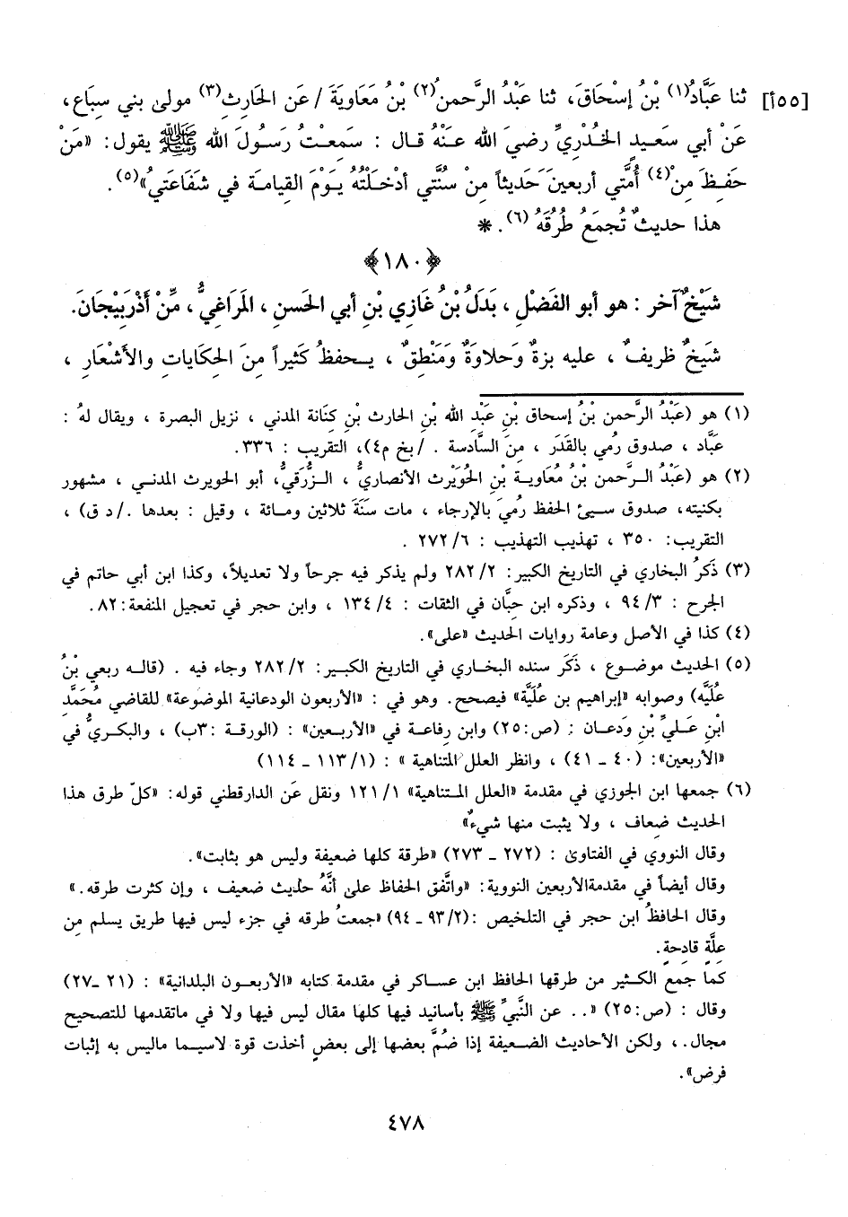 ثنا عَبَّادُ بْنُ إِسْحَاقَ، ثنا عَبْدُ الرَّحْمَنِ بْنُ مُعَاوِيَةَ، عَنِ الْحَارِثِ مَوْلَى بَنِي سِبَاعٍ، عَنْ أَبِي سَعِيدٍ الْخُدْرِيِّ، رَضِيَ اللَّهُ عَنْهُ، قَالَ: سَمِعْتُ رَسُولَ اللَّهِ، صَلَّى اللَّهُ عَلَيْهِ وَسَلَّمَ، يَقُولُ: «مَنْ حَفِظَ من أُمَّتِي أَرْبَعِينَ حَدِيثًا مِنْ سُنَّتِي، أَدْخَلْتُهُ يَوْمَ الْقِيَامَةِ فِي شَفَاعَتِي» .