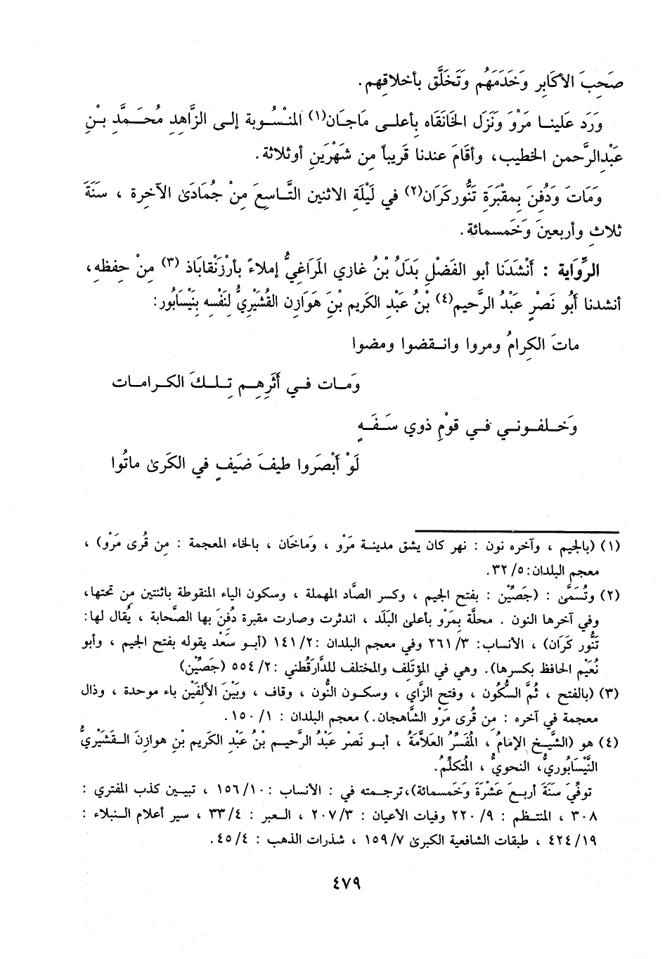 أنشدنا أبو الفضل بدل بن غازي المراغي إملاء بأرزنقاباذ من حفظه، أنشدنا أبو نصر عبد الرحيم بن عبد الكريم بن هوازن القشيري لنفسه بنيسابور: