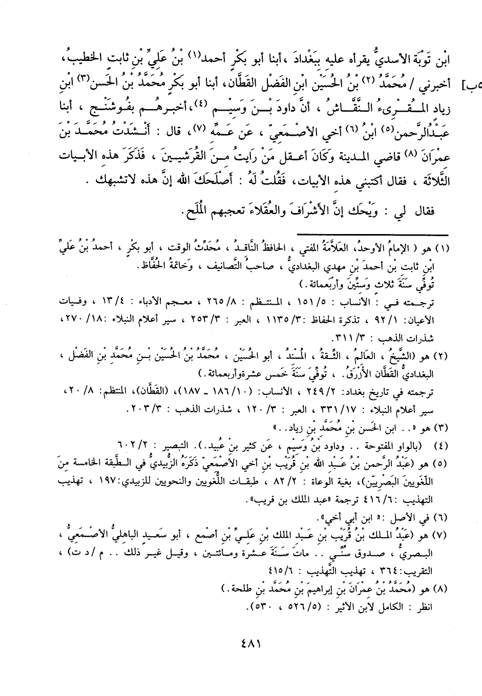 بن توبة الأسدي، يقرأه عليه ببغداد، أبنا أبو بكر أحمد بن علي بن ثابت الخطيب، أخبرني محمد بن الحسين بن الفضل القطان، أبنا أبو بكر محمد بن الحسن بن زياد المقرئ النقاش، أن داود بن وسيم، أخبرهم بفوشنج، أبنا عبد الرحمن ابن أخي الأصمعي، عن عمه، قال: أنشدت محمد بن عمران قاضي المدينة، وكان أعقل من رأيت من القرشيين، فذكر هذه الأبيات الثلاثة، فقال: أكتبني هذه الأبيات، فقلت له: أصلحك الله إن هذه لا تشبهك.