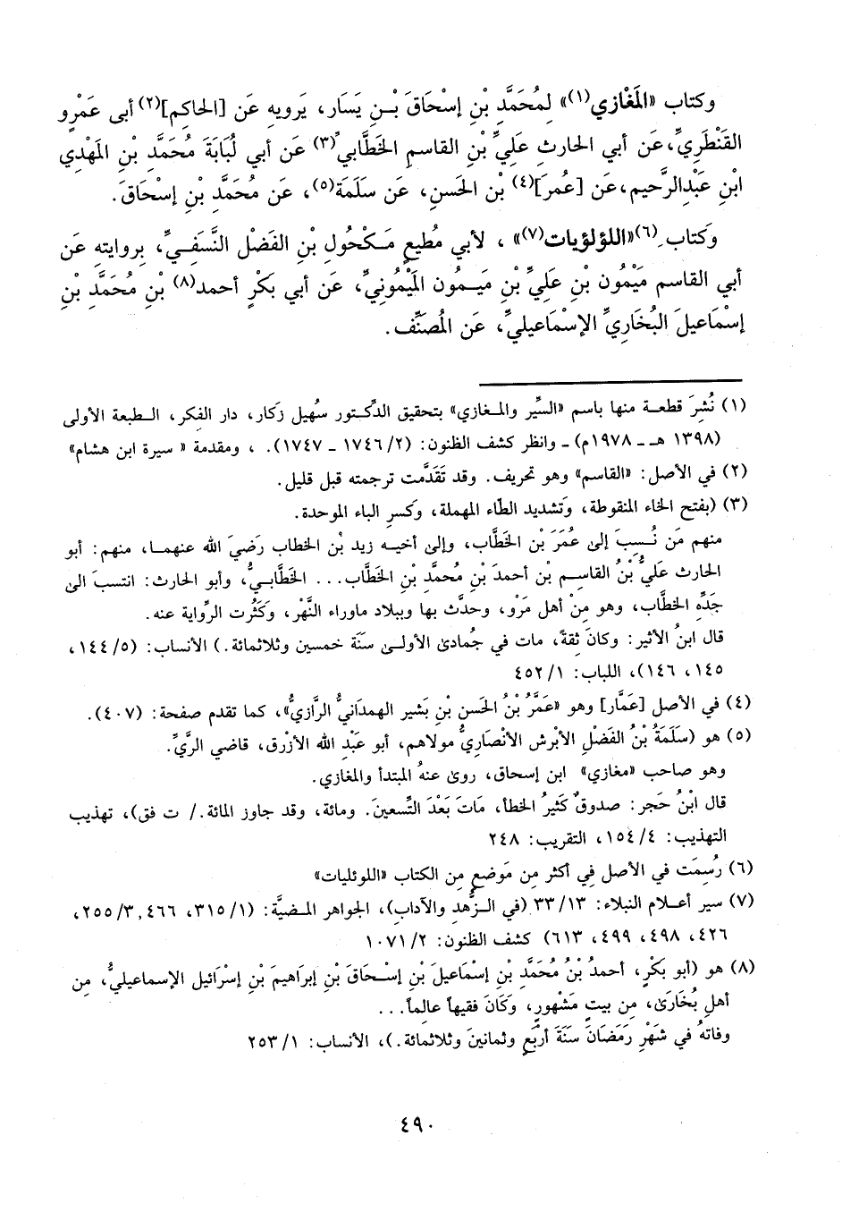 وكتاب المغازي لمحمد بن إسحاق بن يسار، يرويه عن الحاكم أبي عمرو القنطري، عن أبي الحارث علي بن القاسم الخطابي، عن أبي لبابة محمد بن المهدي بن عبد الرحيم، عن عمر بن الحسن، عن سلمة، عن محمد بن إسحاق.