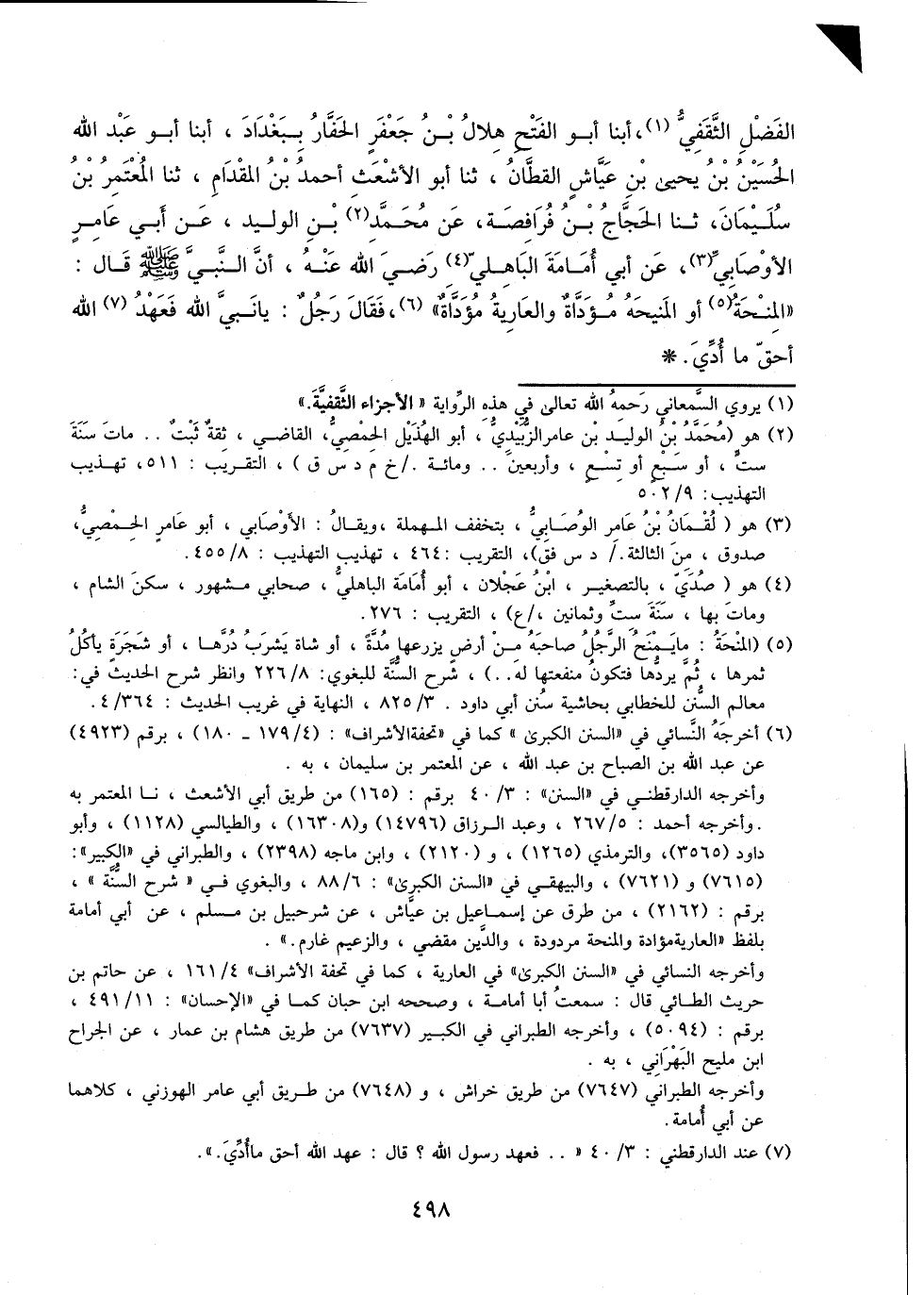 الْفَضْلِ الثَّقَفِيُّ، أبنا أَبُو الْفَتْحِ هِلالُ بْنُ جَعْفَرٍ الْحَفَّارُ بِبَغْدَادَ، أبنا أَبُو عَبْدِ اللَّهِ الْحُسَيْنُ بْنُ يَحْيَى بْنِ عَيَّاشٍ الْقَطَّانُ، حَدَّثَنَا أَبُو الأَشْعَثِ أَحْمَدُ بْنُ الْمِقْدَامِ، ثنا الْمُعْتَمِرُ بْنُ سُلَيْمَانَ، ثنا الْحَجَّاجُ بْنُ فَرَافِصَةَ، عَنْ مُحَمَّدِ بْنِ الْوَلِيدِ، عَنْ أَبِي عَامِرٍ الأَوْصَابِيِّ، عَنْ أَبِي أُمَامَةَ الْبَاهِلِيِّ، رَضِيَ اللَّهُ عَنْهُ، أَنَّ النَّبِيَّ، صَلَّى اللَّهُ عَلَيْهِ وَسَلَّمَ، قَالَ: «الْمِنْحَةُ أَوِ الْمَنِيحَةُ مُؤَدَّاةٌ، وَالْعَارِيَةُ مُؤَدَّاةٌ» ، فَقَالَ رَجُلٌ: يَا نَبِيَّ اللَّهِ فَعَهْدُ اللَّهِ أَحَقُّ مَا أَدَّى