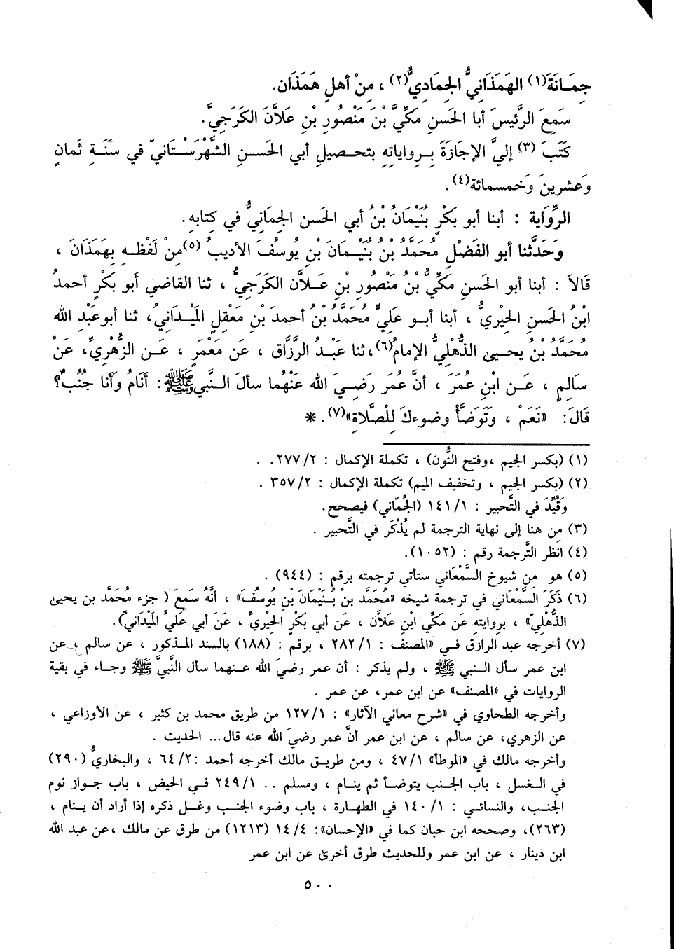 أبنا أَبُو بَكْرٍ بُنَيْمَانُ بْنُ أَبِي الْحَسَنِ الْجُمَّانِيُّ فِي كِتَابِهِ، وَحَدَّثَنَا أَبُو الْفَضْلِ مُحَمَّدُ بْنُ بُنَيْمَانَ بْنِ يُوسُفَ الأَدِيبُ مِنْ لَفْظِهِ بِهَمَذَانَ، قَالا: أبنا أَبُو الْحَسَنِ مَكِّيُّ بْنُ مَنْصُورِ بْنِ عَلانَ الْكَرَجِيُّ، ثنا الْقَاضِي أَبُو بَكْرٍ أَحْمَدُ بْنُ الْحَسَنِ الْحِيرِيُّ، أبنا أَبُو عَلِيٍّ مُحَمَّدُ بْنُ أَحْمَدَ بْنِ مَعْقِلٍ الْمَيْدَانِيُّ، ثنا أَبُو عَبْدِ اللَّهِ مُحَمَّدُ بْنُ يَحْيَى الذُّهْلِيُّ الإِمَامُ، ثنا عَبْدُ الرَّزَّاقِ، عَنْ مَعْمَرٍ، عَنِ الزُّهْرِيِّ، عَنْ سَالِمٍ، عَنِ ابْنِ عُمَرَ، أَنَّ عُمَرَ، رَضِيَ اللَّهُ عَنْهُمَا، سَأَلَ النَّبِيَّ، صَلَّى اللَّهُ عَلَيْهِ وَسَلَّمَ: أَنَامُ وَأَنَا جُنُبٌ؟ قَالَ: «نَعَمْ، وَتَوَضَّأْ وُضُوءَكَ لِلصَّلاةِ»