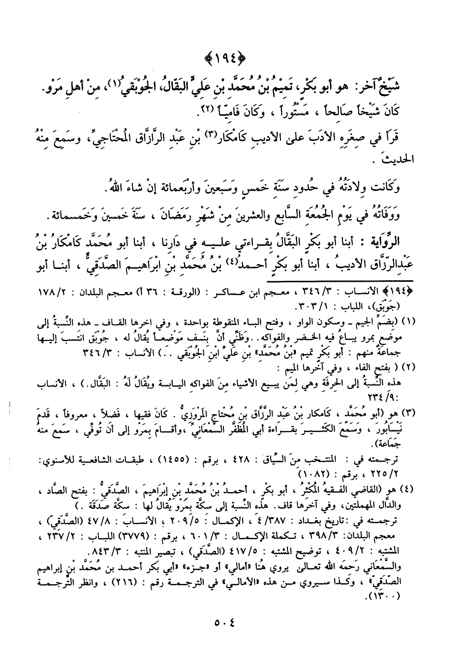 أبنا أَبُو بَكْرٍ الْبَقَّالُ، بِقِرَاءَتِي عَلَيْهِ فِي دَارِنَا، أبنا أَبُو مُحَمَّدٍ كَامْكَارُ بْنُ عَبْدِ الرَّزَّاقِ الأَدِيبُ، أبنا أَبُو بَكْرٍ أَحْمَدُ بْنُ مُحَمَّدِ بْنِ إِبْرَاهِيمَ الصَّدَقِيُّ، أبنا أَبُو