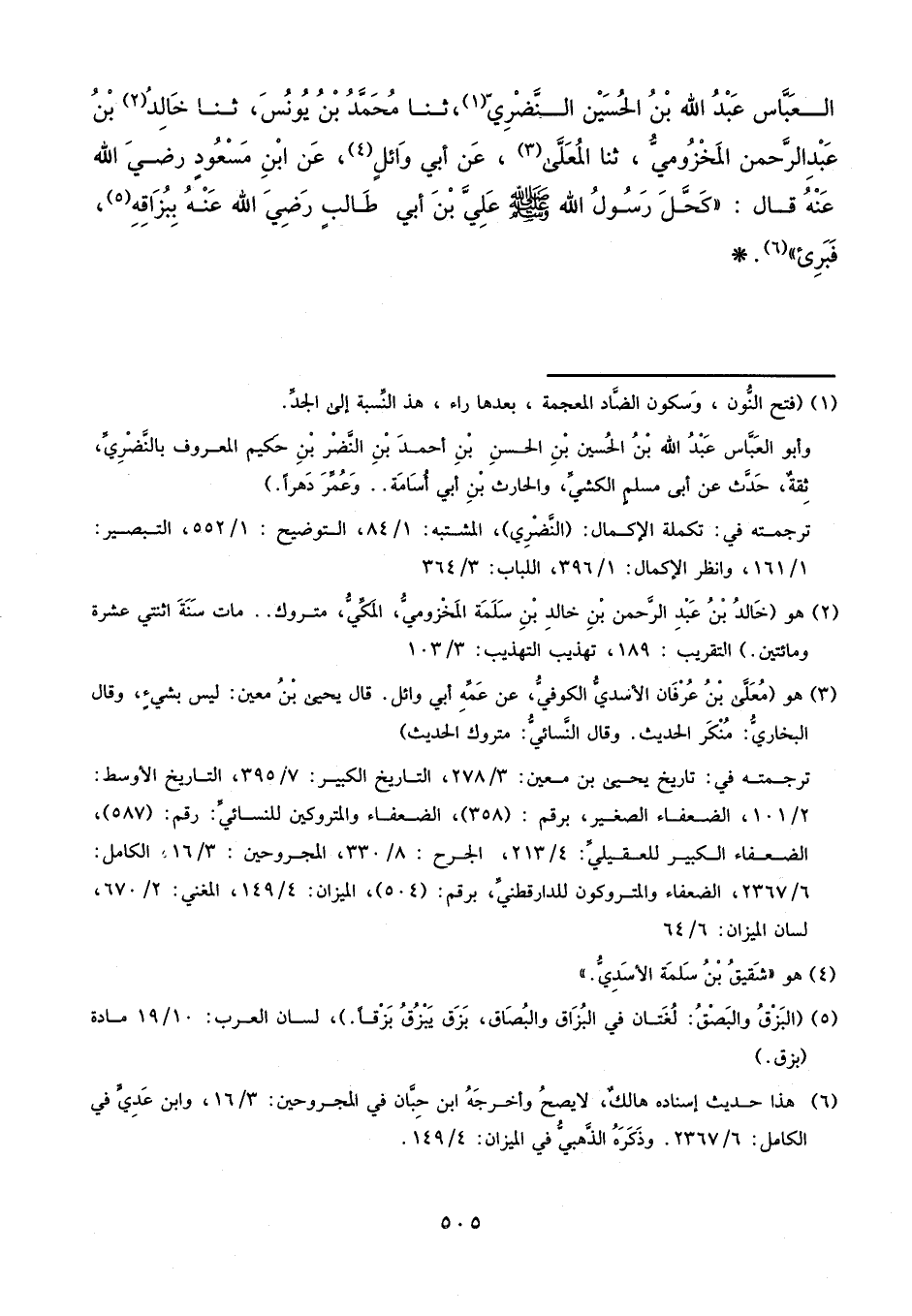 الْعَبَّاسِ عَبْدُ اللَّهِ بْنُ الْحُسَيْنِ النَّضْرِيُّ، ثنا مُحَمَّدُ بْنُ يُونُسَ، ثنا خَالِدُ بْنُ عَبْدِ الرَّحْمَنِ الْمَخْزُومِيُّ، ثنا الْمُعَلَّى، عَنْ أَبِي وَائِلٍ، عَنِ ابْنِ مَسْعُودٍ، رَضِيَ اللَّهُ عَنْهُ، قَالَ: «كَحَّلَ رَسُولُ اللَّهِ، صَلَّى اللَّهُ عَلَيْهِ وَسَلَّمَ، عَلِيَّ بْنَ أَبِي طَالِبٍ، رَضِيَ اللَّهُ عَنْهُ، بِبُزَاقِهِ فَبَرِئَ»