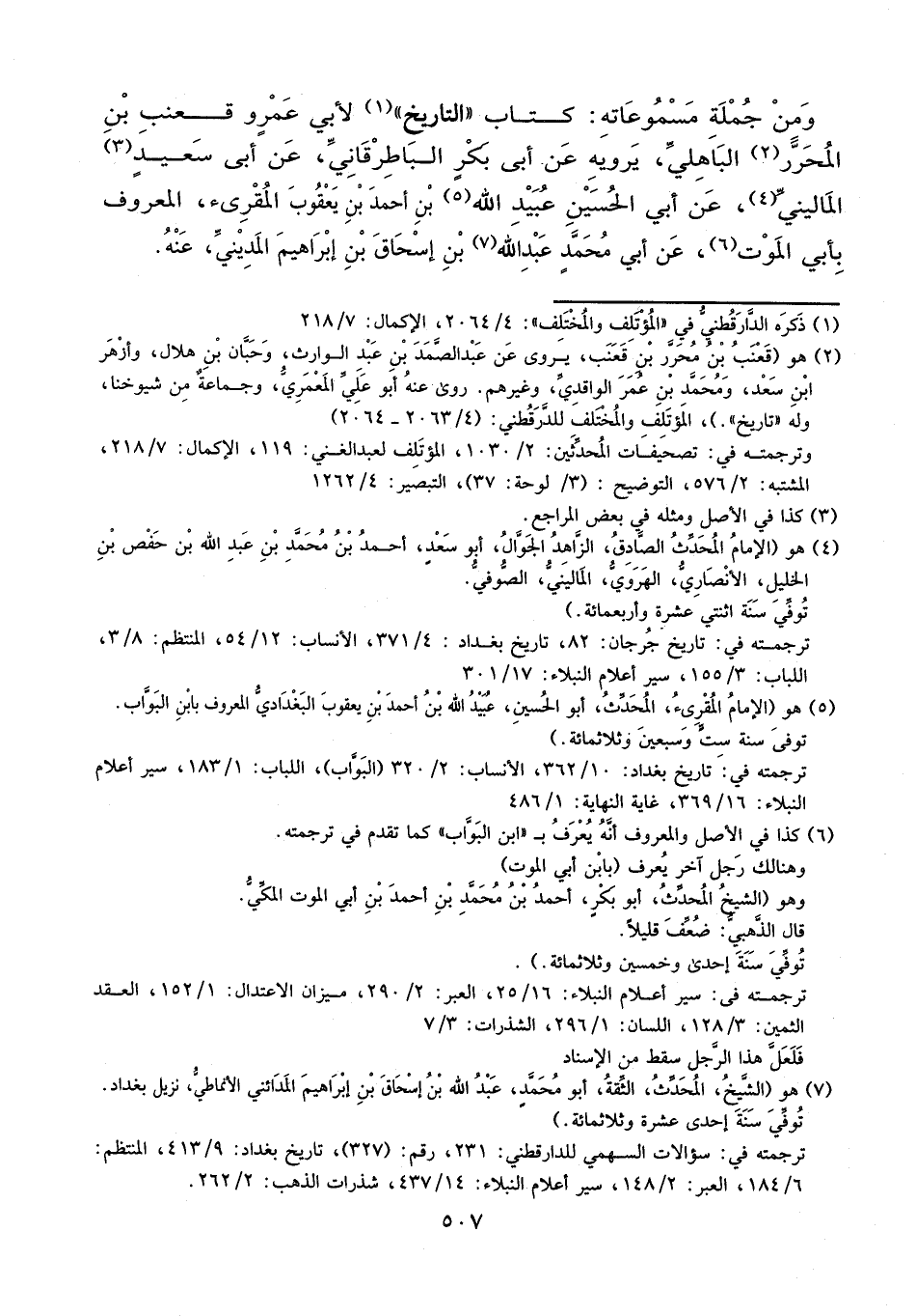 ومن جملة مسموعاته: كتاب التاريخ لأبي عمرو قعنب بن المحرر الباهلي، يرويه عن أبي بكر الباطرقاني، عن أبي سعيد الماليني، عن أبي الحسين عبيد الله بن أحمد بن يعقوب المقرئ المعروف بأبي الموت، عن أبي محمد عبد الله بن إسحاق بن إبراهيم المديني عنه.