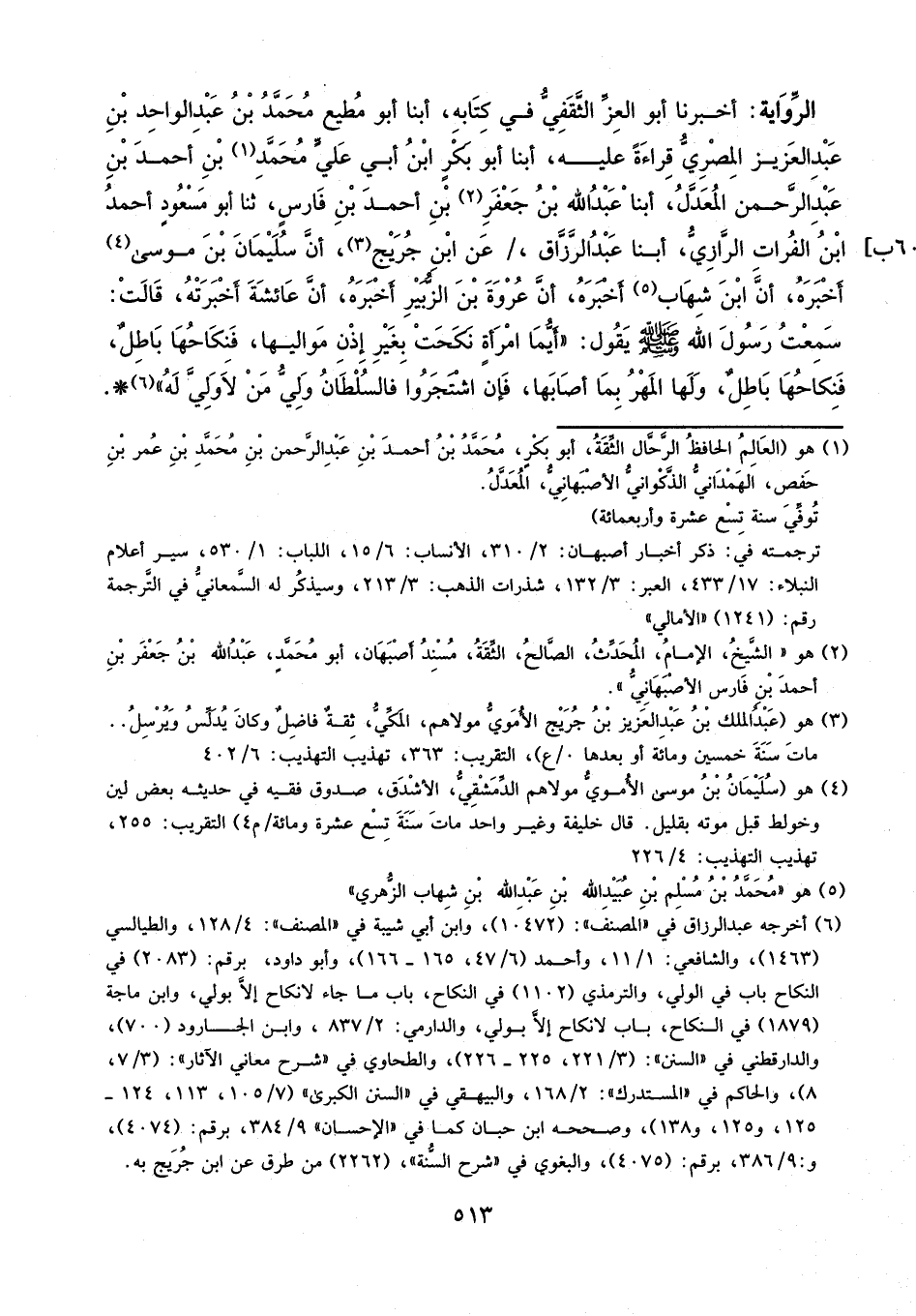 أَخْبَرَنَا أَبُو الْعِزِّ الثَّقَفِيُّ فِي كِتَابِهِ، أَبْنَا أَبُو مُطِيعٍ مُحَمَّدُ بْنُ عَبْدِ الْوَاحِدِ بْنِ عَبْدِ الْعَزِيزِ الْمِصْرِيُّ، قِرَاءَةً عَلَيْهِ، أبنا أَبُو بَكْرِ بْنُ أَبِي عَلِيٍّ مُحَمَّدِ بْنِ أَحْمَدَ بْنِ عَبْدِ الرَّحْمَنِ الْمُعَدَّلُ، أبنا عَبْدُ اللَّهِ بْنُ جَعْفَرِ بْنِ أَحْمَدَ بْنِ فَارِسٍ، ثنا أَبُو مَسْعُودٍ أَحْمَدُ بْنُ الْفُرَاتِ الرَّازِيُّ، أبنا عَبْدُ الرَّزَّاقِ، عَنِ ابْنِ جُرَيْجٍ، أَنَّ سُلَيْمَانَ بْنَ مُوسَى أَخْبَرَهُ، أَنَّ ابْنَ شِهَابٍ أَخْبَرَهُ، أَنَّ عُرْوَةَ بْنَ الزُّبَيْرِ أَخْبَرَهُ، أَنَّ عَائِشَةَ أَخْبَرَتْهُ، قَالَتْ: سَمِعْتُ رَسُولَ اللَّهِ، صَلَّى اللَّهُ عَلَيْهِ وَسَلَّمَ، يَقُولُ: أَيُّمَا امْرَأَةٍ نُكِحَتْ بِغَيْرِ إِذْنِ مَوَالِيهَا فَنِكَاحُهَا بَاطِلٌ، فَنِكَاحُهَا بَاطِلٌ، وَلَهَا الْمَهْرُ بِمَا أَصَابَهَا، فَإِنِ اشْتَجَرُوا فَالسُّلْطَانُ وَلِيُّ مَنْ لا وَلِيَّ لَهُ ".