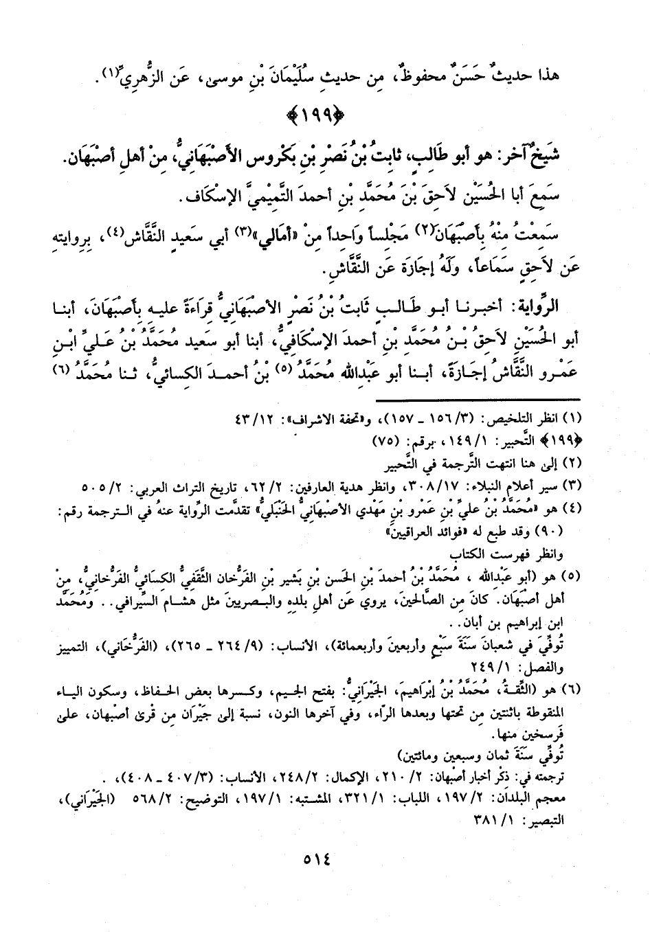 أخبرنا أبو طالب ثابت بن نصر الأصبهاني، قراءة عليه بأصبهان، أبنا أبو الحسين لاحق بن محمد بن أحمد الإسكافي، أبنا أبو سعيد محمد بن علي بن عمرو النقاش إجازة، أبنا أبو عبد الله محمد بن أحمد الكسائي، ثنا محمد