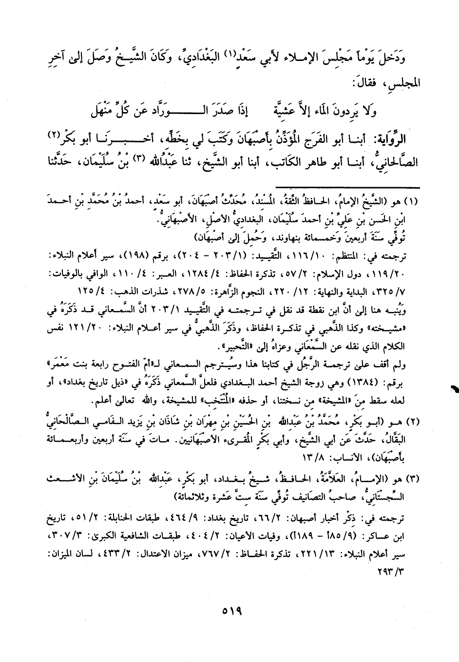 أبنا أبو الفرج المؤذن بأصبهان وكتب لي بخطه، أخبرنا أبو بكر الصالحاني، أبنا أبو طاهر الكاتب، أبنا أبو الشيخ، ثنا عبد الله بن سليمان، حدثنا
