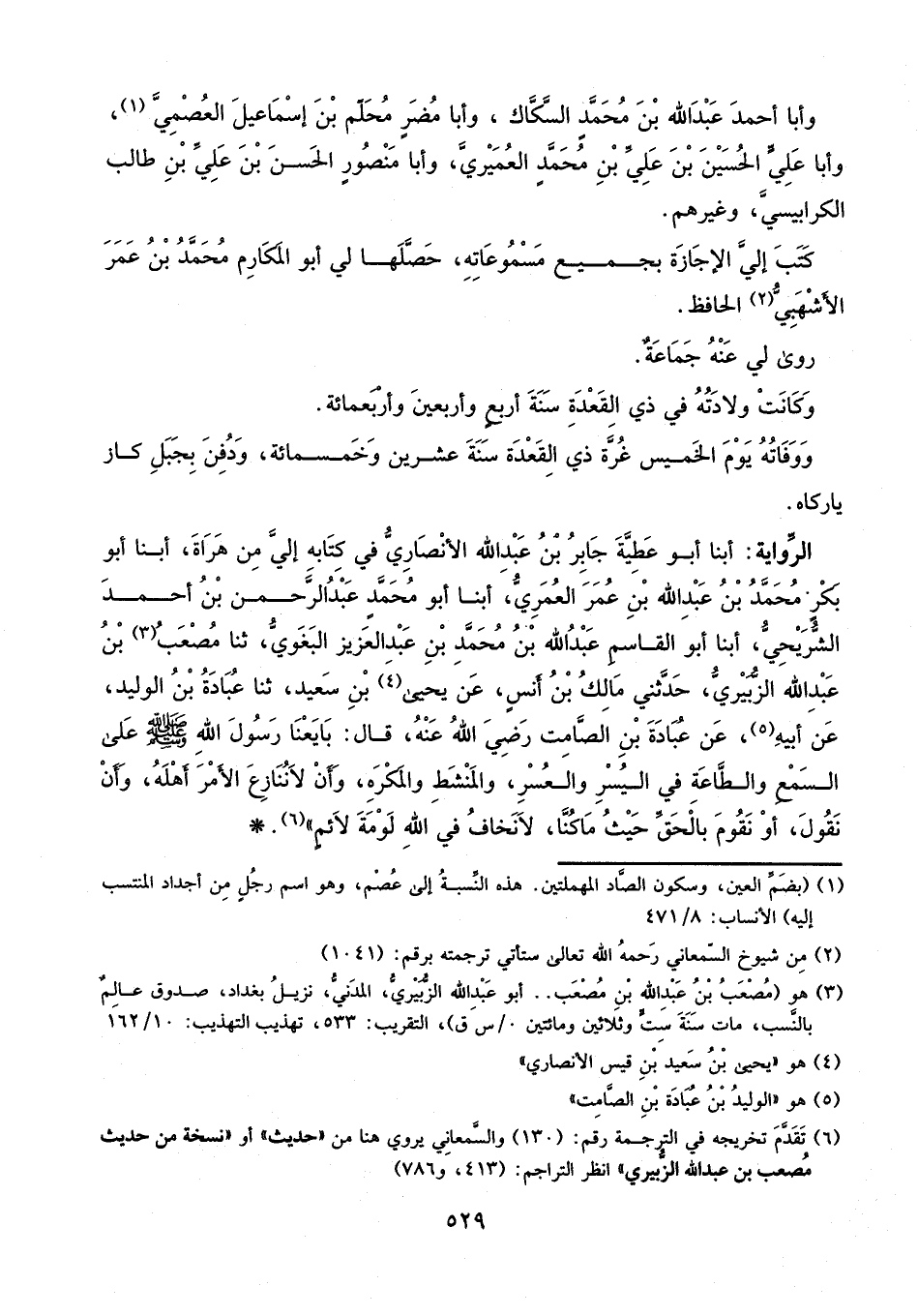 أبنا أَبُو عَطِيَّةَ جَابِرُ بْنُ عَبْدِ اللَّهِ الأَنْصَارِيُّ، فِي كِتَابِهِ إِلَيَّ مِنْ هَرَاةَ، أبنا أَبُو بَكْرٍ مُحَمَّدُ بْنُ عَبْدِ اللَّهِ بْنِ عُمَرَ الْعُمَرِيُّ، أبنا أَبُو مُحَمَّدٍ عَبْدُ الرَّحْمَنِ بْنُ أَحْمَدَ الشُّرَيْحِيُّ، أبنا أَبُو الْقَاسِمِ عَبْدُ اللَّهِ بْنُ مُحَمَّدِ بْنِ عَبْدِ الْعَزِيزِ الْبَغَوِيُّ، ثنا مُصْعَبُ بْنُ عَبْدِ اللَّهِ الزُّبَيْرِيُّ، حَدَّثَنِي مَالِكُ بنُ أَنَسٍ، عَنْ يَحْيَى بْنِ سَعِيدٍ، ثنا عُبَادَةُ بْنُ الْوَلِيدِ، عَنْ أَبِيهِ، عَنْ عُبَادَةَ بْنِ الصَّامِتِ، رَضِيَ اللَّهُ عَنْهُ، قَالَ: «بَايَعْنَا رَسُولَ اللَّهِ، صَلَّى اللَّهُ عَلَيْهِ وَسَلَّمَ، عَلَى السَّمْعِ وَالطَّاعَةِ فِي الْيُسْرِ وَالْعُسْرِ، وَالْمَنْشَطِ وَالْمَكْرَهِ، وَأَنْ لا نُنَازِعَ الأَمْرَ أَهْلَهُ، وَأَنْ نَقُولَ أَوْ نَقُومَ بِالْحَقِّ حَيْثُ مَا كُنَّا، لا نَخَافُ فِي اللَّهِ لَوْمَةَ لائِمٍ» .