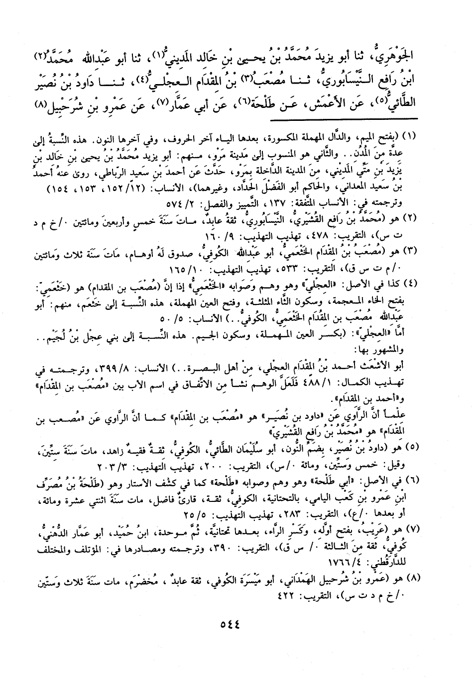 الْجَوْهَرِيُّ، ثنا أَبُو يَزِيدَ مُحَمَّدُ بْنُ يَحْيَى بْنِ خَالِدٍ الْمَدِينِيُّ، ثنا أَبُو عَبْدِ اللَّهِ مُحَمَّدُ بْنُ رَافِعٍ النَّيْسَابُورِيُّ، ثنا مُصْعَبُ بْنُ الْمِقْدَامِ الْعِجْلِيُّ، ثنا دَاوُدُ بْنُ نُصَيْرٍ الطَّائِيُّ، عَنِ الأَعْمَشِ، عَنْ طَلْحَةَ، عَنْ أَبِي عَمَّارٍ، عَنْ عَمْرِو بْنِ شُرَحْبِيلَ،