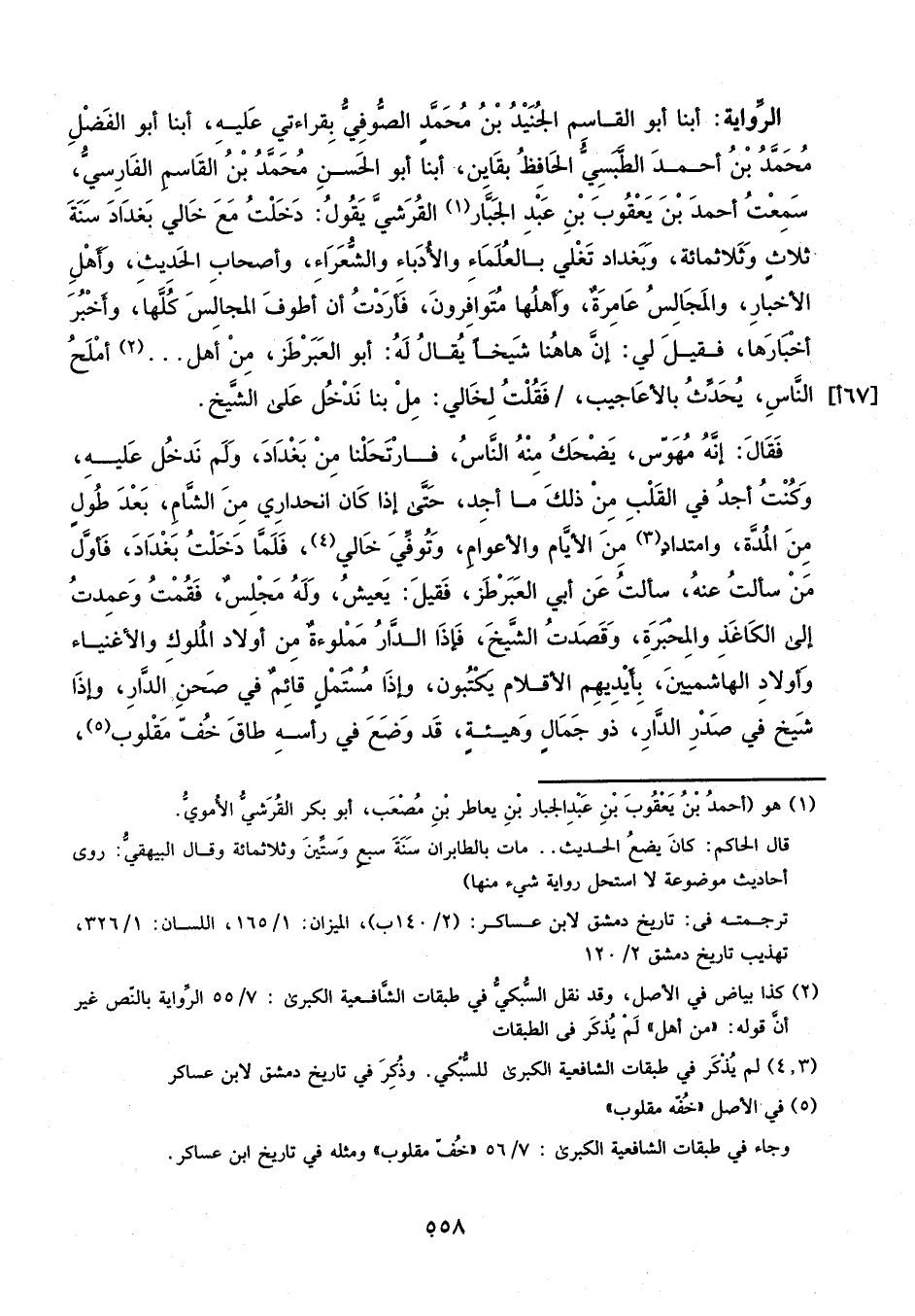 أبنا أبو القاسم الجنيد بن محمد الصوفي، بقراءتي عليه، أبنا أبو الفضل محمد بن أحمد الطبسي الحافظ بقاين، أبنا أبو الحسن محمد بن القاسم الفارسي، سمعت أحمد بن يعقوب بن عبد الجبار القرشي، يقول: دخلت مع خالي بغداد سنة ثلاث وثلاث مائة، وبغداد تغلي بالعلماء والأدباء والشعراء، وأصحاب الحديث وأهل الأخبار، والمجالس عامرة، وأهلها متوافرون، فأردت أن أطوف المجالس كلها، وأخبر أخبارها، فقيل لي: إن هاهنا شيخا يقال له: أبو العبرطز، من أهل. . . . . . . أملح الناس، يحدث بالأعاجيب، فقلت لخالي: مل بنا ندخل على الشيخ.
