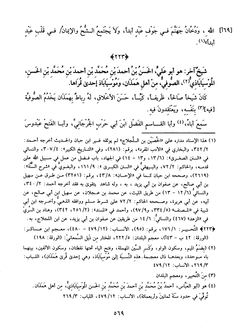 شيخ آخر: هو أبو علي الحسن بن أحمد بن محمد بن أحمد بن محمد بن الحسن الموسياباذي الصوفي، من أهل همذان، وموسياباذ إحدى قراها.