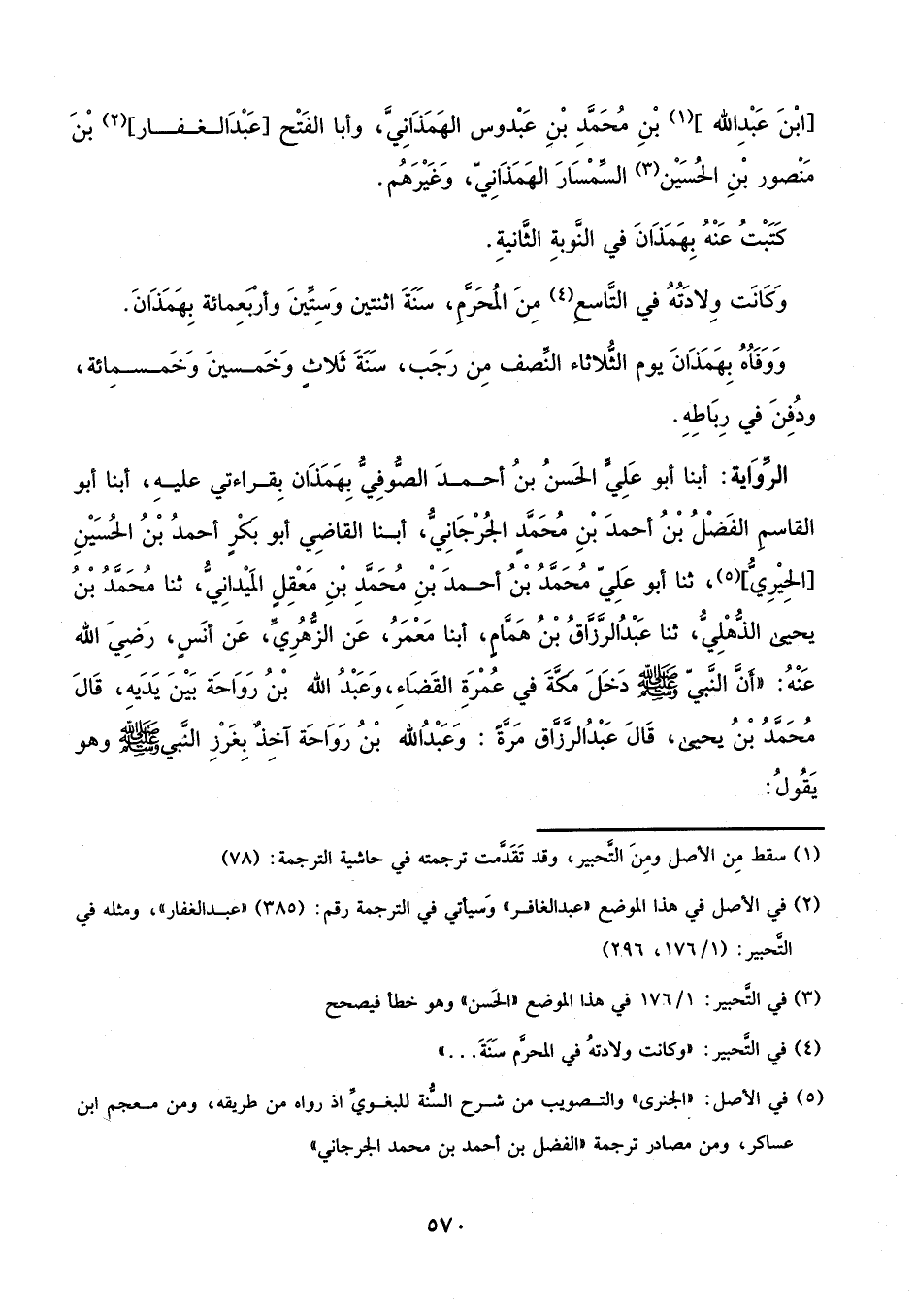 أبنا أَبُو عَلِيٍّ الْحَسَنُ بْنُ أَحْمَدَ الصُّوفِيُّ، بِهَمَذَانَ بِقِرَاءَتِي عَلَيْهِ، أبنا أَبُو الْقَاسِمِ الْفَضْلُ بْنُ أَحْمَدَ بْنِ مُحَمَّدٍ الْجُرْجَانِيُّ، أبنا الْقَاضِي أَبُو بَكْرٍ أَحْمَدُ بْنُ الْحُسَيْنِ الْحِيرِيُّ، ثنا أَبُو عَلِيٍّ مُحَمَّدُ بْنُ أَحْمَدَ بْنِ مُحَمَّدِ بْنِ مَعْقِلٍ الْمَيْدَانِيُّ، ثنا مُحَمَّدُ بْنُ يَحْيَى الذُّهْلِيُّ، ثنا عَبْدُ الرَّزَّاقِ بْنُ هَمَّامٍ، أبنا مَعْمَرٌ، عَنِ الزُّهْرِيِّ، عَنْ أَنَسٍ، رَضِيَ اللَّهُ عَنْهُ: " أَنَّ النَّبِيَّ، صَلَّى اللَّهُ عَلَيْهِ وَسَلَّمَ، دَخَلَ مَكَّةَ فِي عُمْرَةِ الْقَضَاءِ، وَعَبْدُ اللَّهِ بْنُ رَوَاحَةَ بَيْنَ يَدَيْهِ، قَالَ مُحَمَّدُ بْنُ يَحْيَى: قَالَ عَبْدُ الرَّزَّاقِ مَرَّةً: وَعَبْدُ اللَّهِ بْنُ رَوَاحَةَ آخِذٌ بِغَرْزِ النَّبِيَّ، صَلَّى اللَّهُ عَلَيْهِ وَسَلَّمَ، وَهُوَ يَقُولُ:
