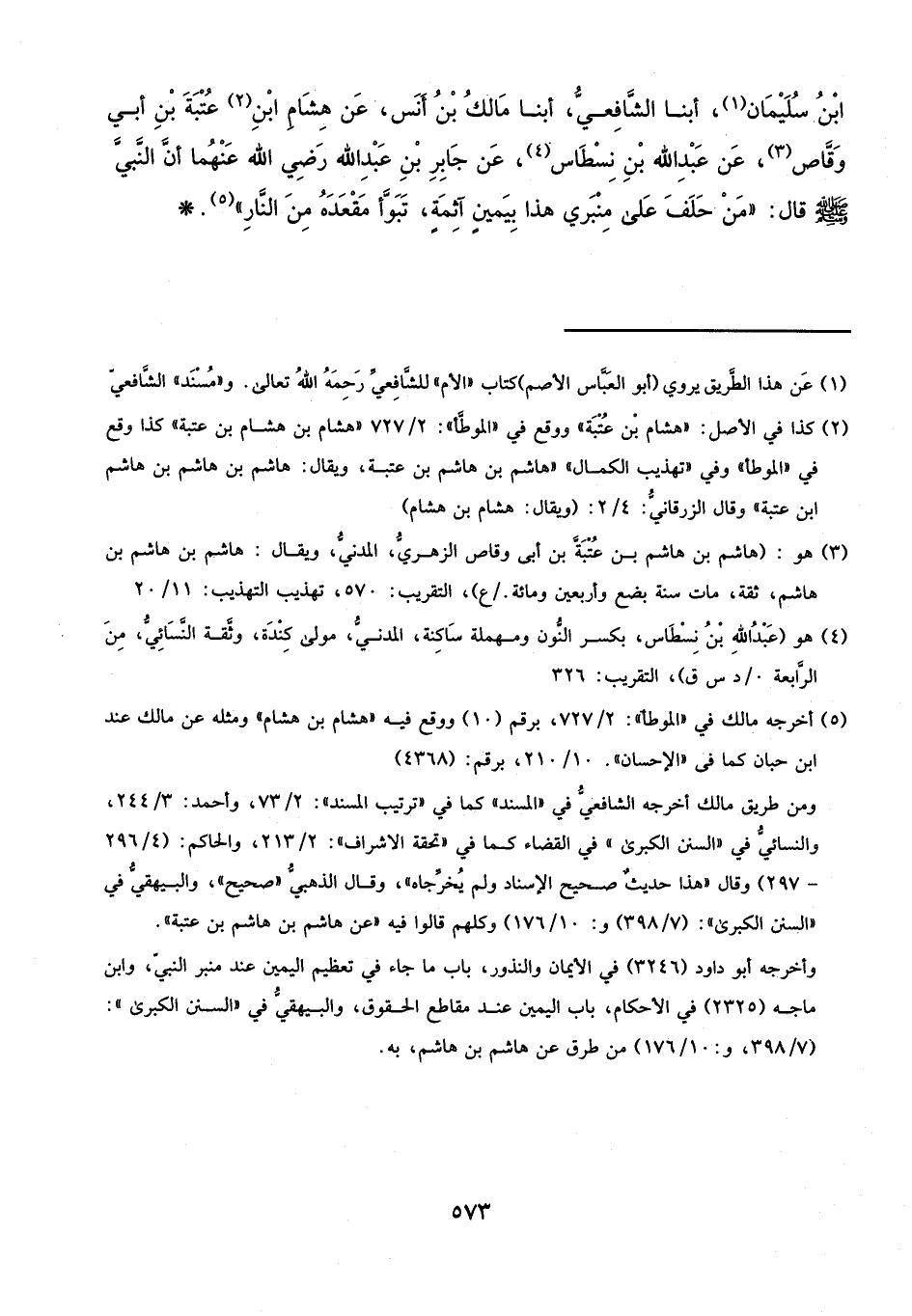 بْنُ سُلَيْمَانَ، أبنا الشَّافِعِيُّ، أبنا مَالِكُ بنُ أنس، عَنْ هِشَامِ بْنِ عُتْبَةَ بْنِ أَبِي وَقَّاصٍ، عَنْ عَبْدِ اللَّهِ بْنِ نِسْطَاسٍ، عَنْ جَابِرِ بْنِ عَبْدِ اللَّهِ، رَضِيَ اللَّهُ عَنْهُما، أَنَّ النَّبِيَّ، صَلَّى اللَّهُ عَلَيْهِ وَسَلَّمَ، قَالَ: «مَنْ حَلَفَ عَلَى مِنْبَرِي هَذَا بِيَمِينٍ آثِمَةٍ، تَبَوَّأَ مَقْعَدَهُ مِنَ النَّارِ»