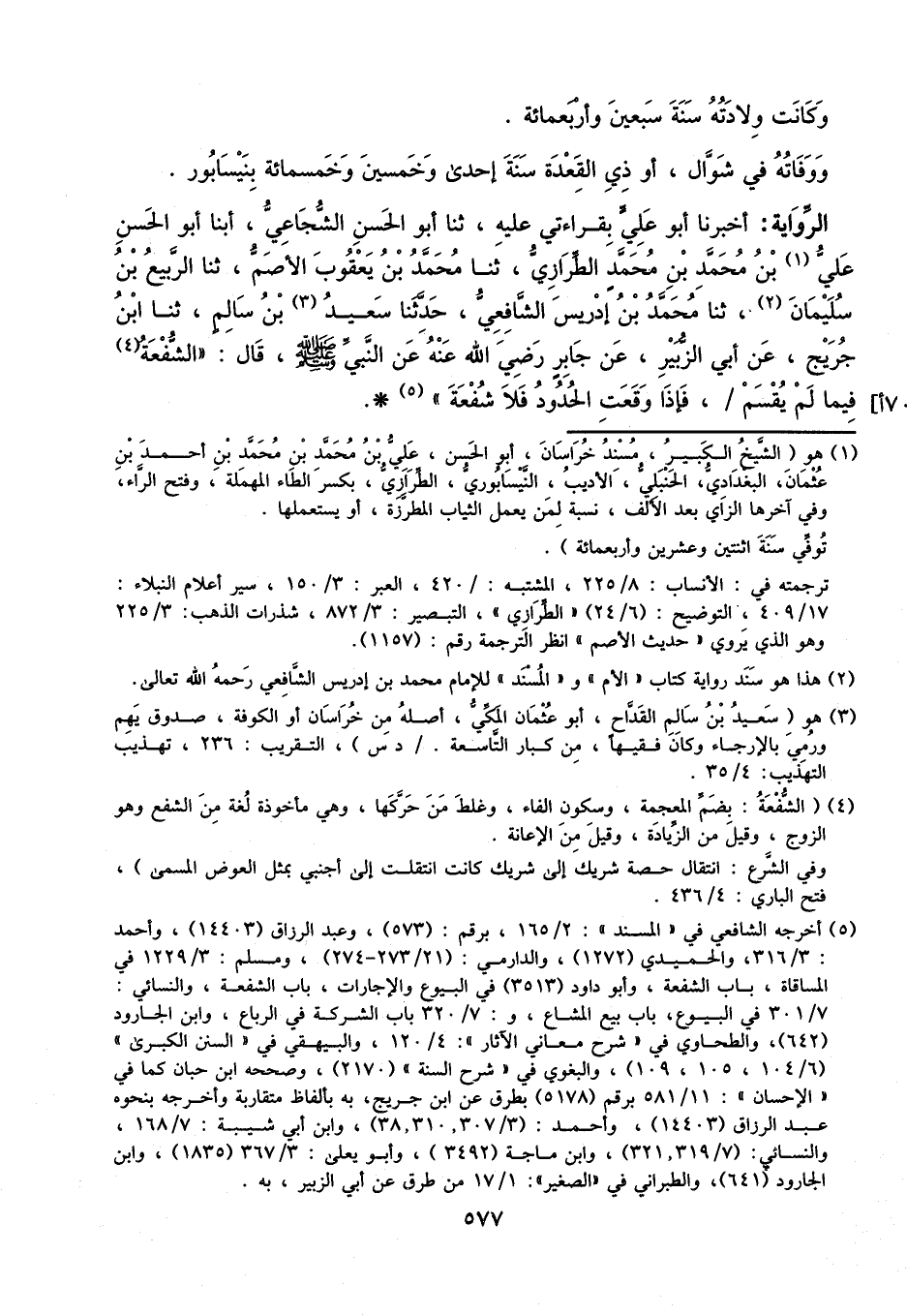 أَخْبَرَنَا أَبُو عَلِيٍّ، بِقِرَاءَتِي عَلَيْهِ، ثنا أَبُو الْحَسَنِ الشُّجَاعِيُّ، أبنا أَبُو الْحَسَنِ عَلِيُّ بْنُ مُحَمَّدِ بْنِ مُحَمَّدٍ الطِّرَازِيُّ، ثنا مُحَمَّدُ بْنُ يَعْقُوبَ الأَصَمُّ، ثنا الرَّبِيعُ بْنُ سُلَيْمَانَ، ثنا مُحَمَّدُ بْنُ إِدْرِيسَ الشَّافِعِيُّ، حَدَّثَنَا سَعِيدُ بْنُ سَالِمٍ، ثنا ابْنُ جُرَيْجٍ، عَنْ أَبِي الزُّبَيْرِ، عَنْ جَابِرٍ، رَضِيَ اللَّهُ عَنْهُ، عَنِ النَّبِيِّ، صَلَّى اللَّهُ عَلَيْهِ وَسَلَّمَ، قَالَ: «الشُّفْعَةُ فِيمَا لَمْ يُقْسَمْ، فَإِذَا وَقَعَتِ الْحُدُودُ فَلا شُفْعَةَ»
