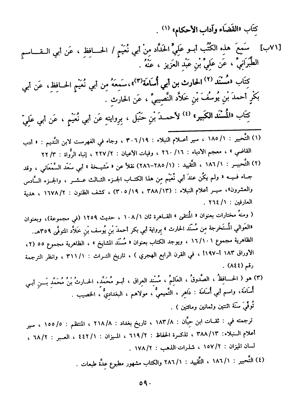 كتاب مسند الحارث بن أبي أسامة، سمعه من أبي نعيم الحافظ، عن أبي بكر أحمد بن يوسف بن خلاد النصيبي، عن الحارث.
