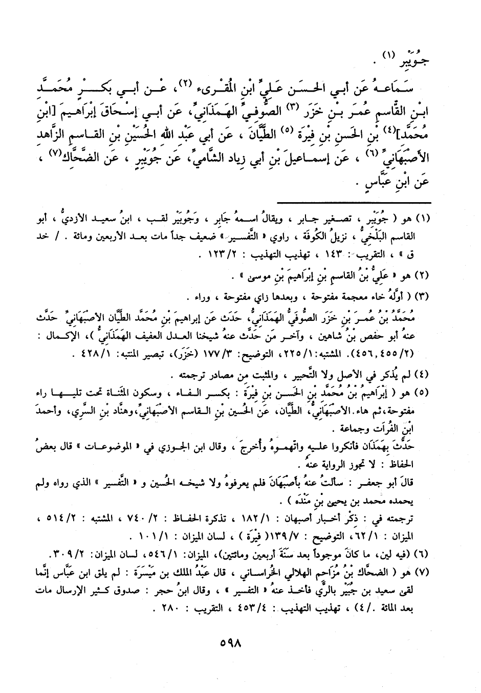 سماعه عن أبي الحسن علي ابن المقرئ، عن أبي بكر محمد بن القاسم عمر بن خرز الصوفي الهمذاني، عن أبي إسحاق إبراهيم بن محمد بن الحسن بن فيرة الطيان، عن أبي عبد الله الحسين بن القاسم الزاهد الأصبهاني، عن إسماعيل بن أبي زياد الشامي، عن جويبر، عن الضحاك، عن ابن عباس.