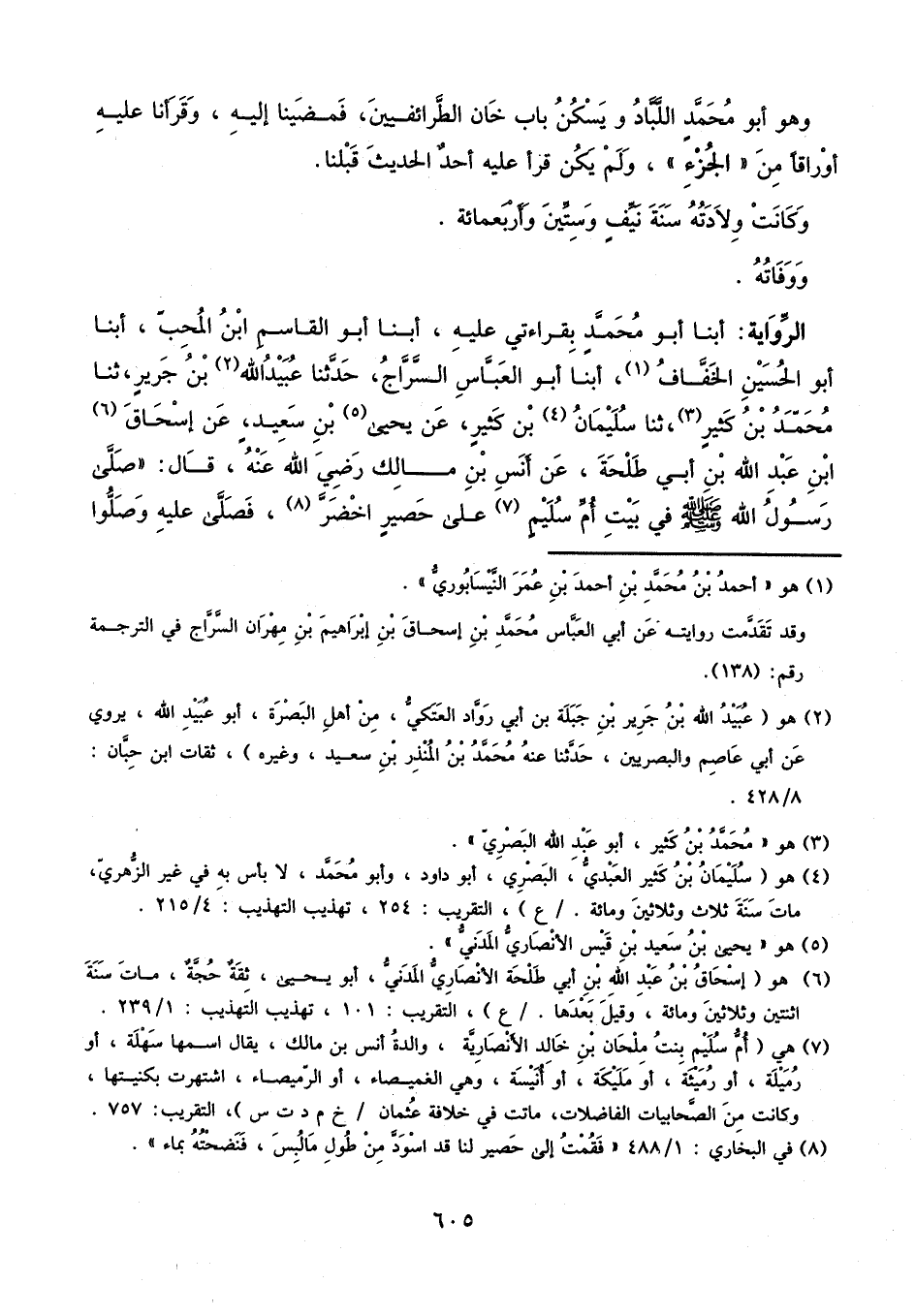 أبنا أَبُو مُحَمَّدٍ، بِقِرَاءَتِي عَلَيْهِ، أَبْنَا أَبُو الْقَاسِمِ بْنُ الْمُحِبِّ، أَبْنَا أَبُو الْحُسَيْنِ الْخَفَّافُ، أبنا أَبُو الْعَبَّاسِ السَّرَّاجُ، حَدَّثَنَا عُبَيْدُ اللَّهِ بْنُ جَرِيرٍ، ثَنَا مُحَمَّدُ بْنُ كَثِيرٍ، ثنَا سُلَيْمَانُ بْنُ كَثِيرٍ، عن يَحْيَى بْنُ سَعِيدٍ، عَنْ إِسْحَاقَ بْنِ عَبْدِ اللَّهِ بْنِ أَبِي طَلْحَةَ، عَنْ أَنَسِ بْنِ مَالِكٍ، رَضِيَ اللَّهُ عَنْهُ، قَالَ: «صَلَّى رَسُولُ اللَّهِ، صَلَّى اللَّهُ عَلَيْهِ وَسَلَّمَ، فِي بَيْتِ أُمِّ سُلَيْمٍ عَلَى حَصِيرٍ أَخْضَرَ، فَصَلَّى عَلَيْهِ وَصَلُّوا