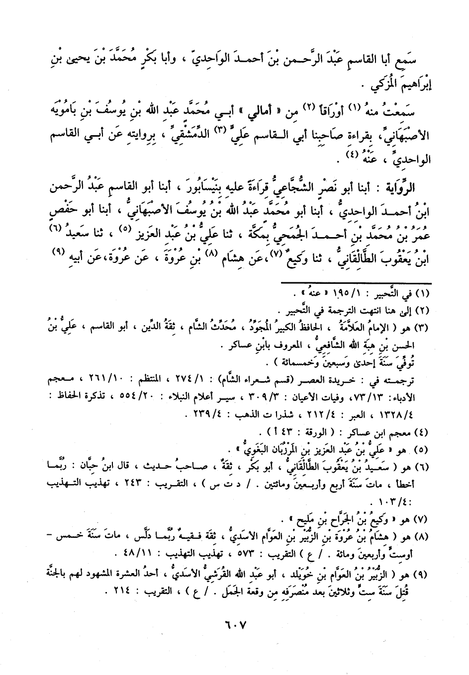 أبنا أبو نصر الشجاعي، قراءة عليه بنيسابور، أبنا أبو القاسم عبد الرحمن بن أحمد الواحدي، أبنا أبو محمد عبد الله بن يوسف الأصبهاني، أبنا أبو حفص عمر بن محمد بن أحمد الجمحي بمكة، ثنا علي بن عبد العزيز، ثنا سعيد بن يعقوب الطالقاني، ثنا وكيع، عن هشام بن عروة، عن عروة، عن أبيه،