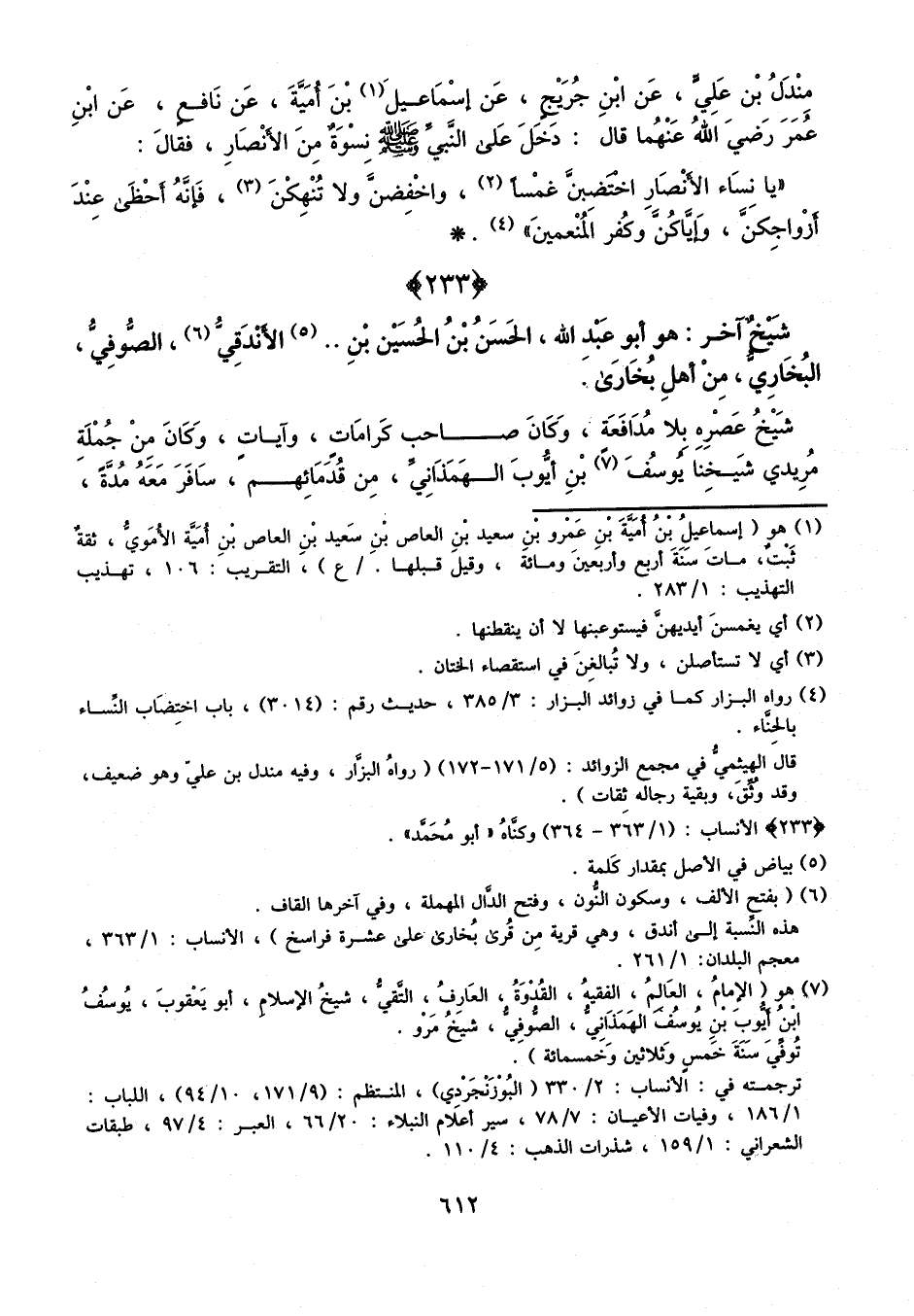 مَنْدَلُ بْنُ عَلِيٍّ، عَنِ ابْنِ جُرَيْجٍ، عَنْ إِسْمَاعِيلَ بْنِ أُمَيَّةَ، عَنْ نَافِعٍ، عَنِ ابْنِ عُمَرَ، رَضِيَ اللَّهُ عَنْهُمَا، قَالَ: دَخَلَ عَلَى النَّبِيِّ، صَلَّى اللَّهُ عَلَيْهِ وَسَلَّمَ، نِسْوَةٌ مِنَ الأَنْصَارِ، فَقَالَ: «يَا نِسَاءَ الأَنْصَارِ، اخْتَضِبْنَ غَمْسًا، وَاخْفِضْنَ وَلا تَنْهَكْنَ، فَإِنَّهُ أَحْظَى عِنْدَ أَزْوَاجِكُنَّ، وَإِيَّاكُنَّ وَكُفْرَ الْمُنَعَّمِينَ»