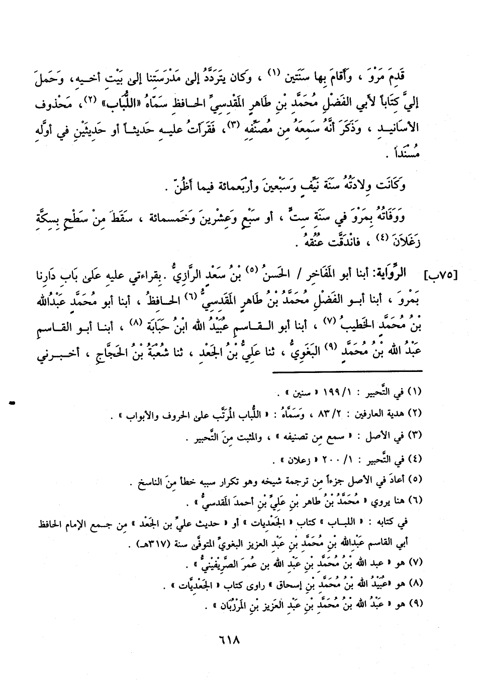 قدم مرو، وأقام بها سنتين، وكان يتردد إلى مدرستنا إلى بيت أخيه، وحمل إلي كتابا لأبي الفضل محمد بن طاهر المقدسي الحافظ، سماه اللباب، محذوف الأسانيد وذكر أنه سمعه من مصنفه، فقرأت عليه حديثا أو حديثين في أوله مسندا.