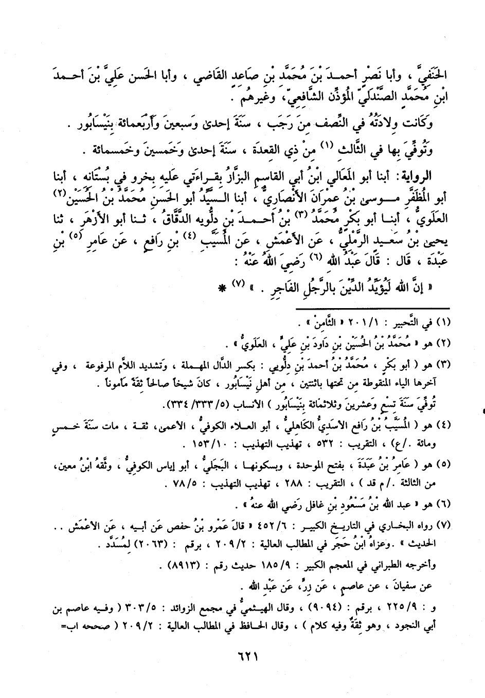 أبنا أبو المعالي بن أبي القاسم البزاز، بقراءتي عليه بخرو في بستانه، أبنا أبو المظفر موسى بن عمران الأنصاري، أبنا السيد أبو الحسن محمد بن الحسين العلوي، أبنا أبو بكر محمد بن أحمد بن دلويه الدقاق، ثنا أبو الأزهر، ثنا يحيى بن سعيد الرملي، عن الأعمش، عن المسيب بن رافع، عن عامر بن عبدة، قال: قال عبد الله، رضي الله عنه: إن الله ليؤيد الدين بالرجل الفاجر.
