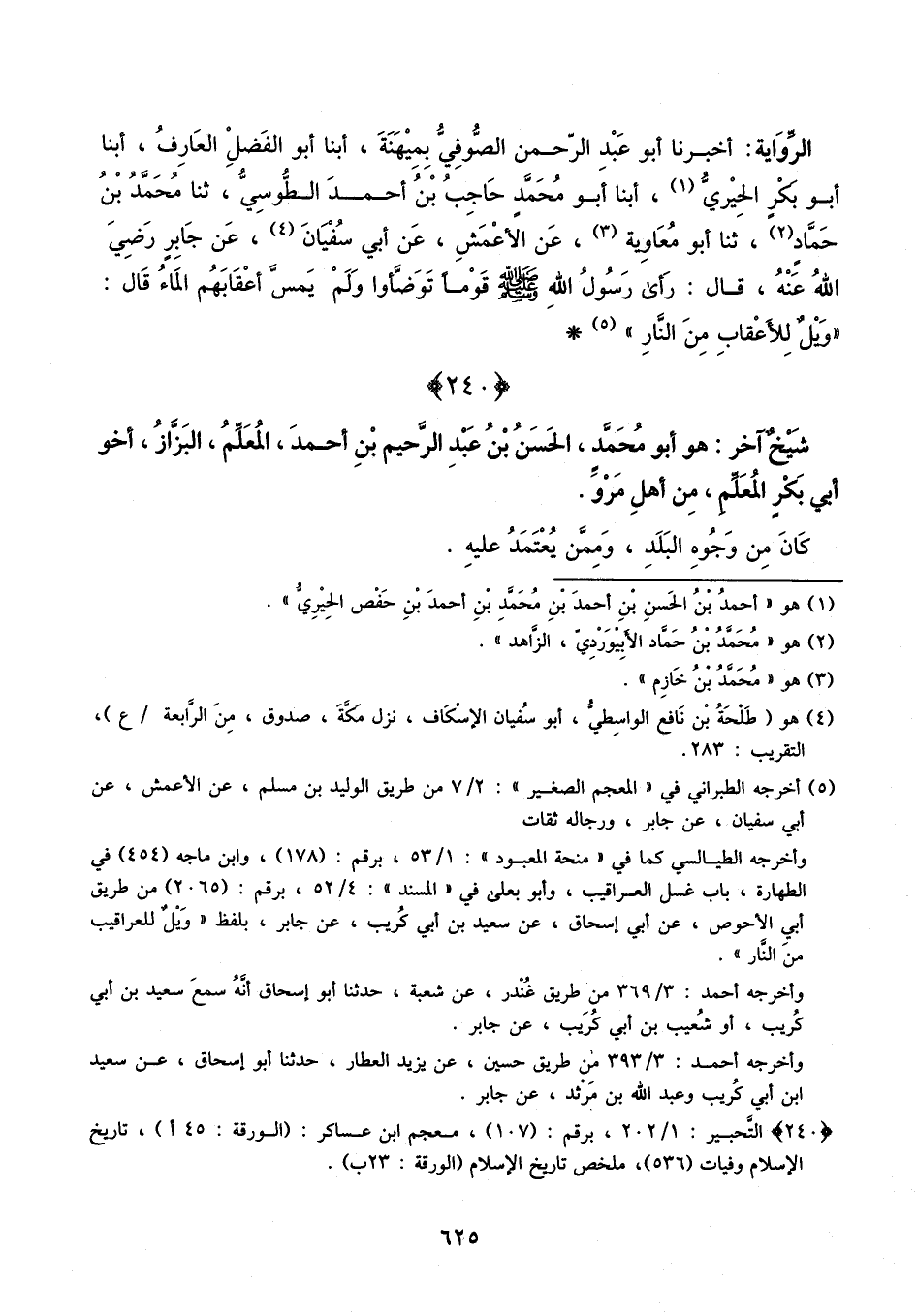 أَخْبَرَنَا أَبُو عَبْدِ الرَّحْمَنِ الصُّوفِيُّ بِمِيهَنَةَ، أَبْنَا أَبُو الْفَضْلِ الْعَارِفُ، أبنا أَبُو بَكْرٍ الْحِيرِيُّ، أبنا أَبُو مُحَمَّدٍ حَاجِبُ بْنُ أَحْمَدَ الطُّوسِيُّ، ثنا مُحَمَّدُ بْنُ حَمَّادٍ، ثَنَا أَبُو مُعَاوِيَةَ، عَنِ الأَعْمَشِ، عَنْ أَبِي سُفْيَانَ، عَنْ جَابِرٍ، رَضِيَ اللَّهُ عَنْهُ، قَالَ: رَأَى رَسُولُ اللَّهِ، صَلَّى اللَّهُ عَلَيْهِ وَسَلَّمَ، قَوْمًا تَوَضَّئُوا، وَلَمْ يَمَسَّ أَعْقَابَهُمُ الْمَاءُ، قَالَ: «وَيْلٌ لِلأَعْقَابِ مِنَ النَّارِ»