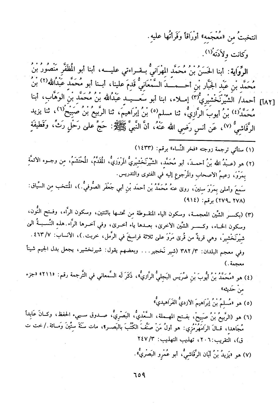 أبنا الْحَسَنُ بْنُ مُحَمَّدٍ الْمِهْرَانِيُّ، بِقِرَاءَتِي عَلَيْهِ، أَبْنَا أَبُو الْمُظَفَّرِ مَنْصُورُ بْنُ مُحَمَّدِ بْنِ عَبْدِ الْجَبَّارِ بْنِ أَحْمَدَ السَّمْعَانِيُّ، قَدِمَ عَلَيْنَا، أَبْنَا أَبُو مُحَمَّدٍ عَبْدُ اللَّهِ بْنُ أَحْمَدَ الشيرنخشِيرِيُّ، إِمْلاءً، أبنا أَبُو سَعِيدٍ عَبْدُ اللَّهِ بْنُ مُحَمَّدِ بْنِ عَبْدِ الْوَهَّابِ، أبنا مُحَمَّدُ بْنُ أَيُّوبَ الرَّازِيُّ، ثنا مُسْلِمُ بْنُ إِبْرَاهِيمَ، ثنا الرَّبِيعُ بْنُ صُبَيْحٍ، ثنا يَزِيدُ الرَّقَاشِيُّ، عَنْ أَنَسٍ، رَضِيَ اللَّهُ عَنْهُ، أَنَّ النَّبِيَّ، صَلَّى اللَّهُ عَلَيْهِ وَسَلَّمَ: حَجَّ عَلَى رَحْلٍ رَثٍّ، وَقَطِيفَةٍ