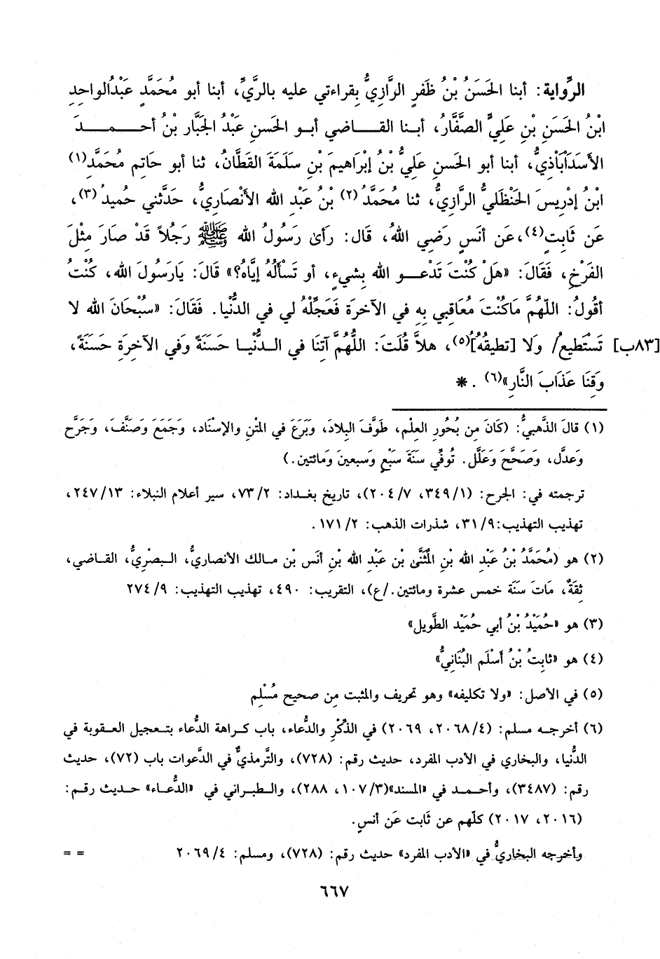 أبنا الْحَسَنُ بْنُ ظُفَرَ الرَّازِيُّ، بِقِرَاءَتِي عَلَيْهِ بِالرَّيِّ، أبنا أَبُو مُحَمَّدٍ عَبْدُ الْوَاحِدِ بْنُ الْحَسَنِ بْنِ عَلِيٍّ الصَّفَّارُ، أبنا الْقَاضِي أَبُو الْحَسَنِ عَبْدُ الْجَبَّارِ بْنُ أَحْمَدَ الأَسَدَابَاذِيُّ، أبنا أَبُو الْحَسَنِ عَلِيُّ بْنُ إِبْرَاهِيمَ بْنِ سَلَمَةَ الْقَطَّانُ، ثنا أَبُو حَاتِمٍ مُحَمَّدُ بْنُ إِدْرِيسَ الْحَنْظَلِيُّ الرَّازِيُّ، ثنا مُحَمَّدُ بْنُ عَبْدِ اللَّهِ الأَنْصَارِيُّ، حَدَّثَنِي حُمَيْدٌ، عَنْ ثَابِتٍ، عَنْ أَنَسٍ، رَضِيَ اللَّهُ عَنْهُ، قَالَ: رَأَى رَسُولُ اللَّهِ، صَلَّى اللَّهُ عَلَيْهِ وَسَلَّمَ، رَجُلًا قَدْ صَارَ مِثْلَ الْفَرْخِ، فَقَالَ: «هَلْ كُنْتَ تَدْعُو اللَّهَ بِشَيْءٍ، أَوْ تَسْأَلُهُ إِيَّاهُ؟» قَالَ: يَا رَسُولَ اللَّهِ، كُنْتُ أَقُولُ: اللَّهُمَّ مَا كُنْتَ مُعَاقِبِي بِهِ فِي الآخِرَةِ فَعَجِّلْهُ لِي فِي الدُّنْيَا.