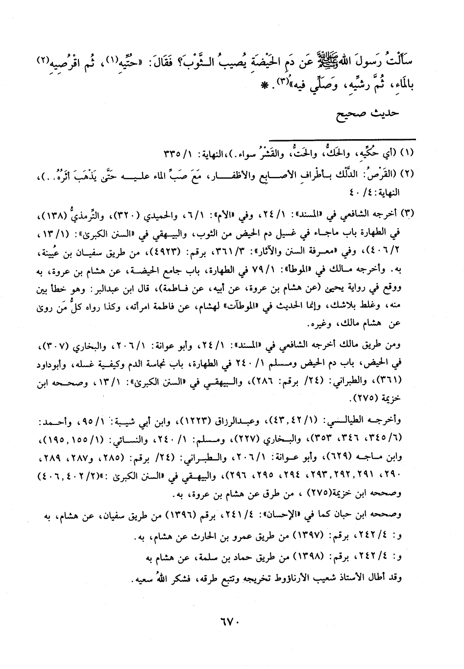 سَأَلْتُ رَسُولَ اللَّهِ، صَلَّى اللَّهُ عَلَيْهِ وَسَلَّمَ، عَنْ دَمِ الْحَيْضَةِ يُصِيبُ الثَّوْبَ؟ فَقَالَ: «حُتِّيهِ، ثُمَّ اقْرُصِيهِ بِالْمَاءِ، ثُمَّ رُشِّيهِ، وَصَلِّي فِيهِ» حَدِيثٌ صَحِيحٌ